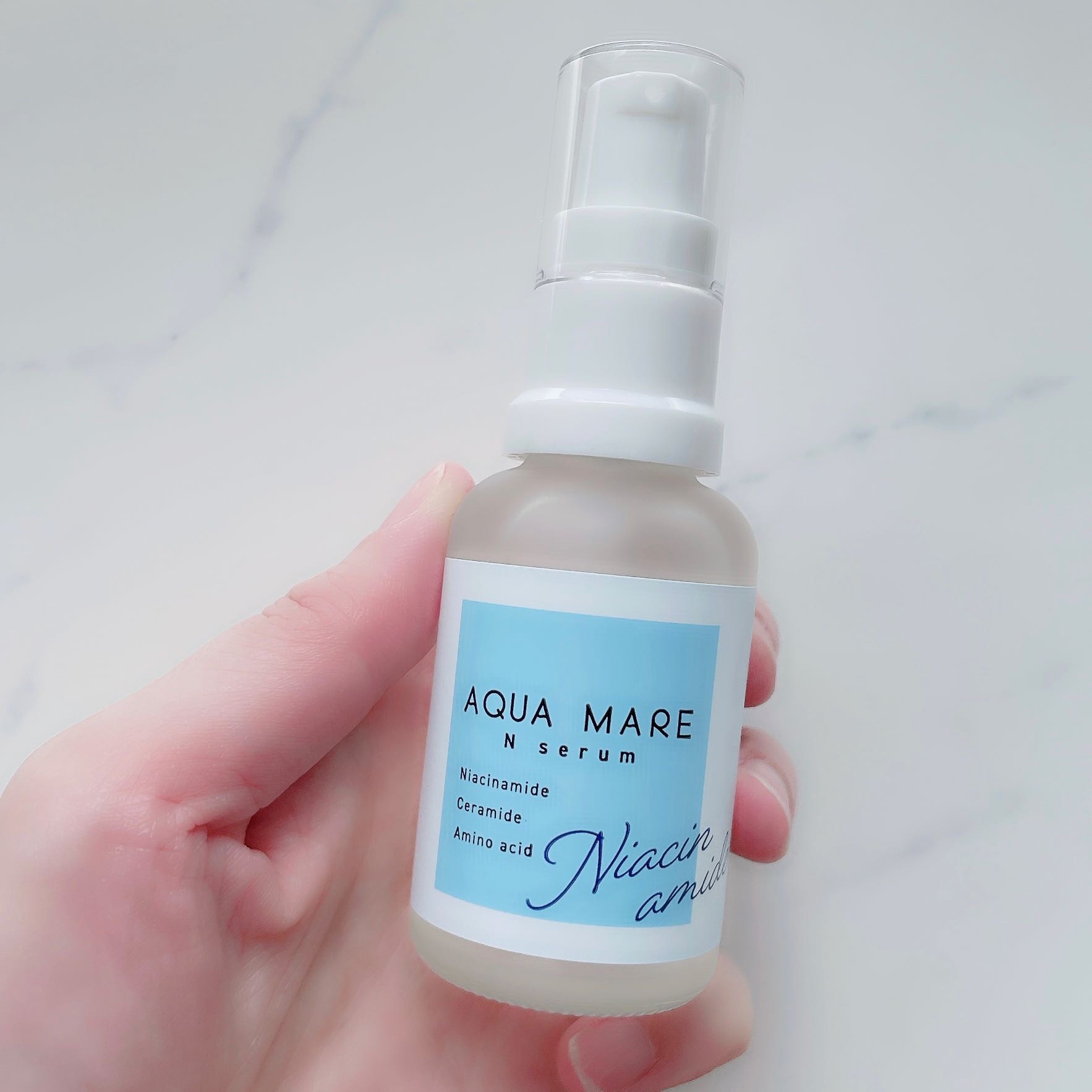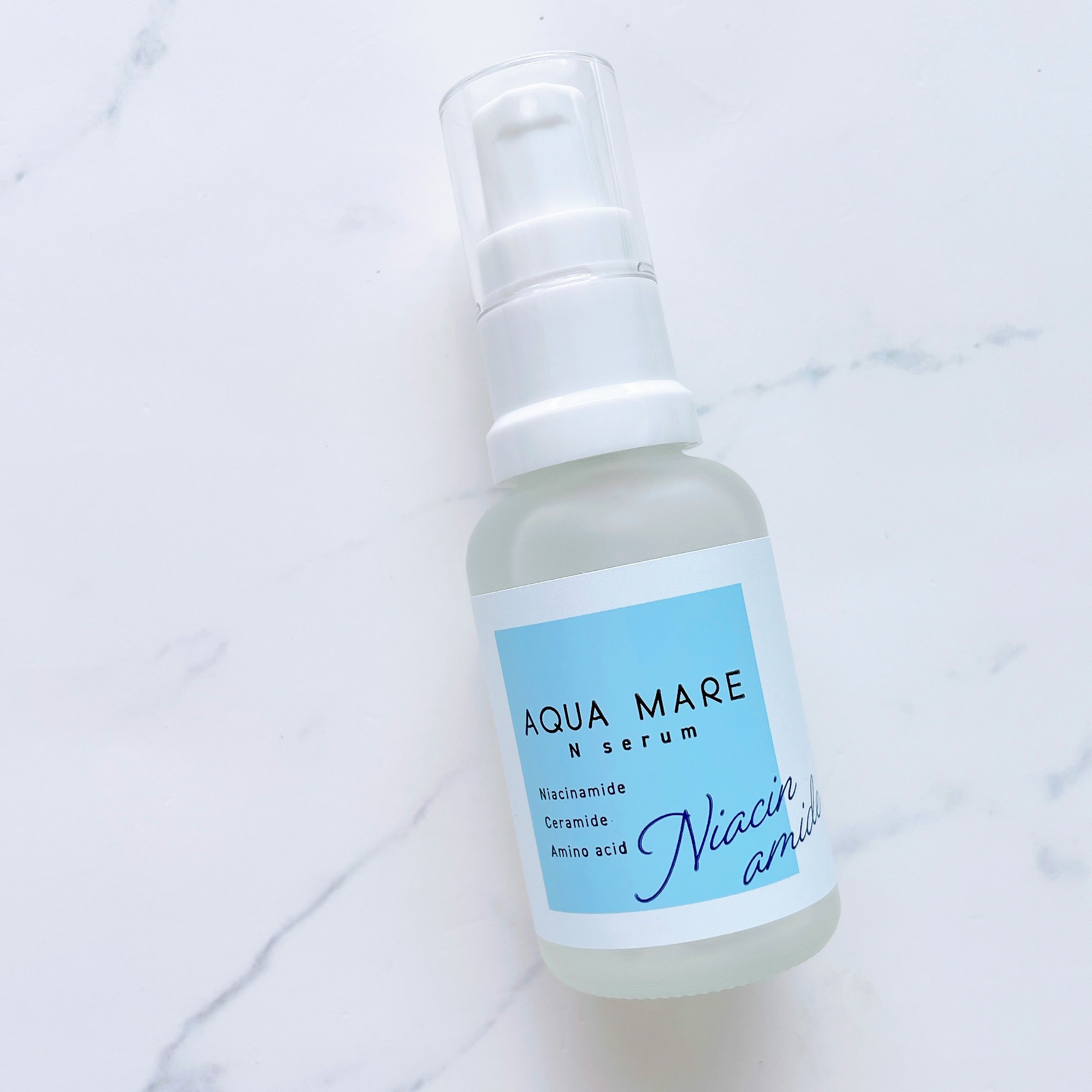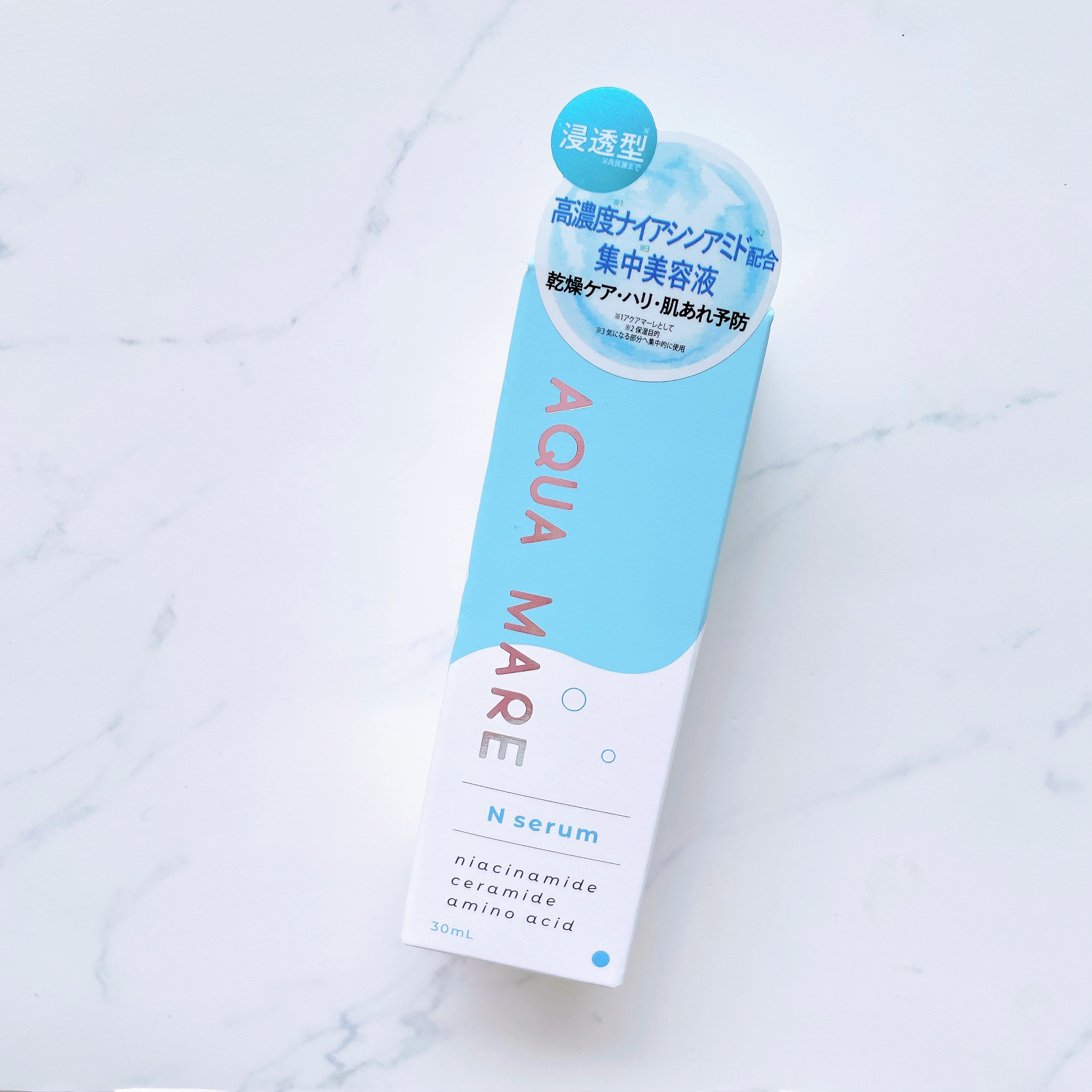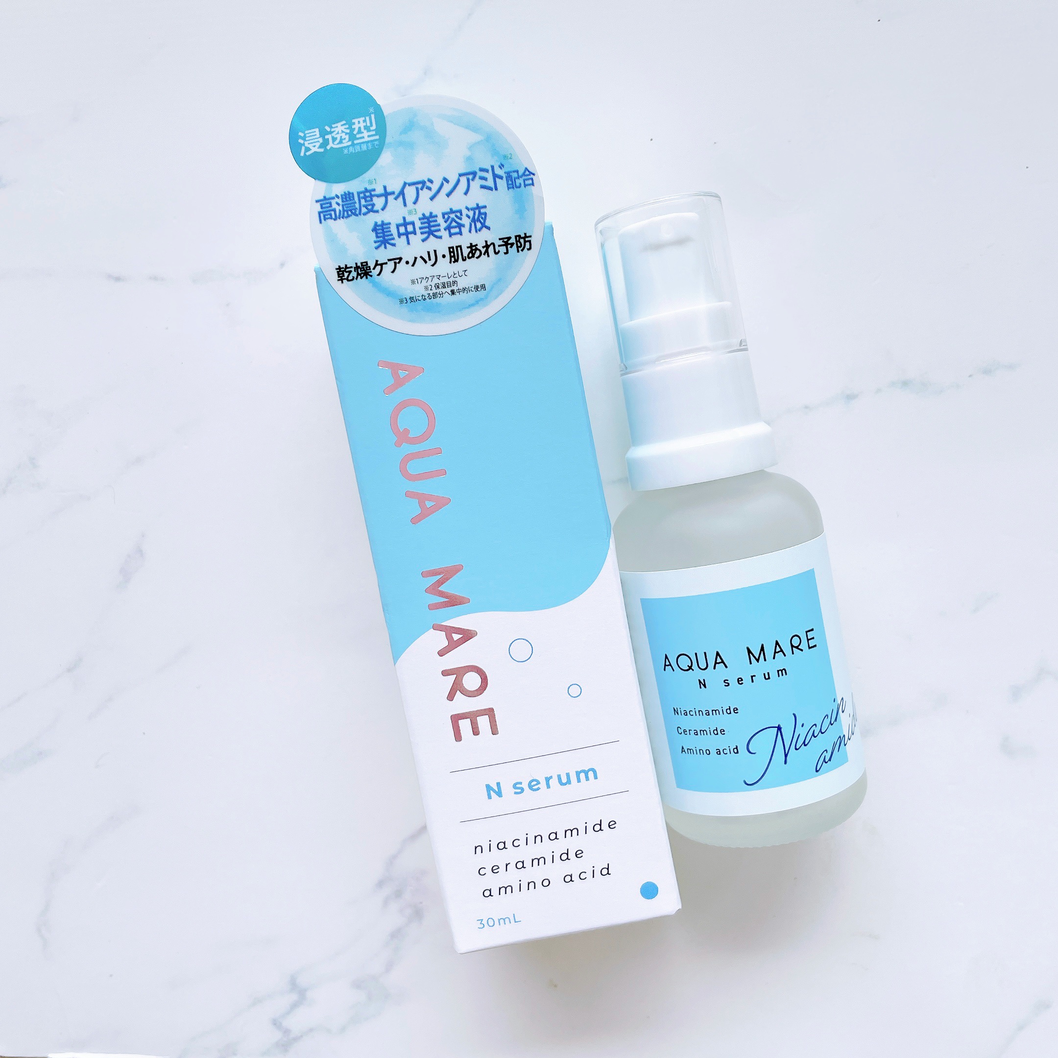 - コンセプトは『海』 AQUAMAREは生体に適した、ミネラルバランスを持つ海由来の成分を中心に作りました。 アクアプラセンタ*1、海洋深層水*1、海藻エキス*1、高濃度*2ナイアシンアミド*1配合、乾燥ケア、ハリ、肌荒れ予防の集中美容液。 *1保湿成分 *2アクアマーレとして
