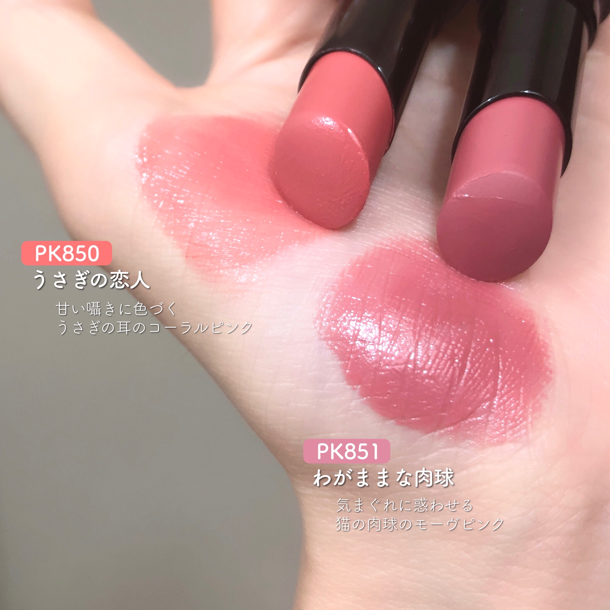 ヴィセ夏の新作✨ネクストバズリップ ネンマクフェイクルージュをご紹介です! 瞬く間に欠品続出の話題の粘膜カラーのリップ💄 飲食や唇をこすりあわせたりせず60秒ほど待つと唇に色が定着するタイプ。 PK850 うさぎの恋人🐇 甘い囁きに色づく、うさぎの耳のコーラルピンク PK851 わがままな肉球🐈 気まぐれに惑わせる、猫の肉球のモーヴピンク 発色も良くて肌馴染みがいい!!! ヴィセは発色◎でぽってりむっちり感のある仕上がり パケはシンプルでコンパクトなので嵩張らずによし 見つけたら要チェックです! 気になっている方のご参考に少しでもなりますと幸いです!