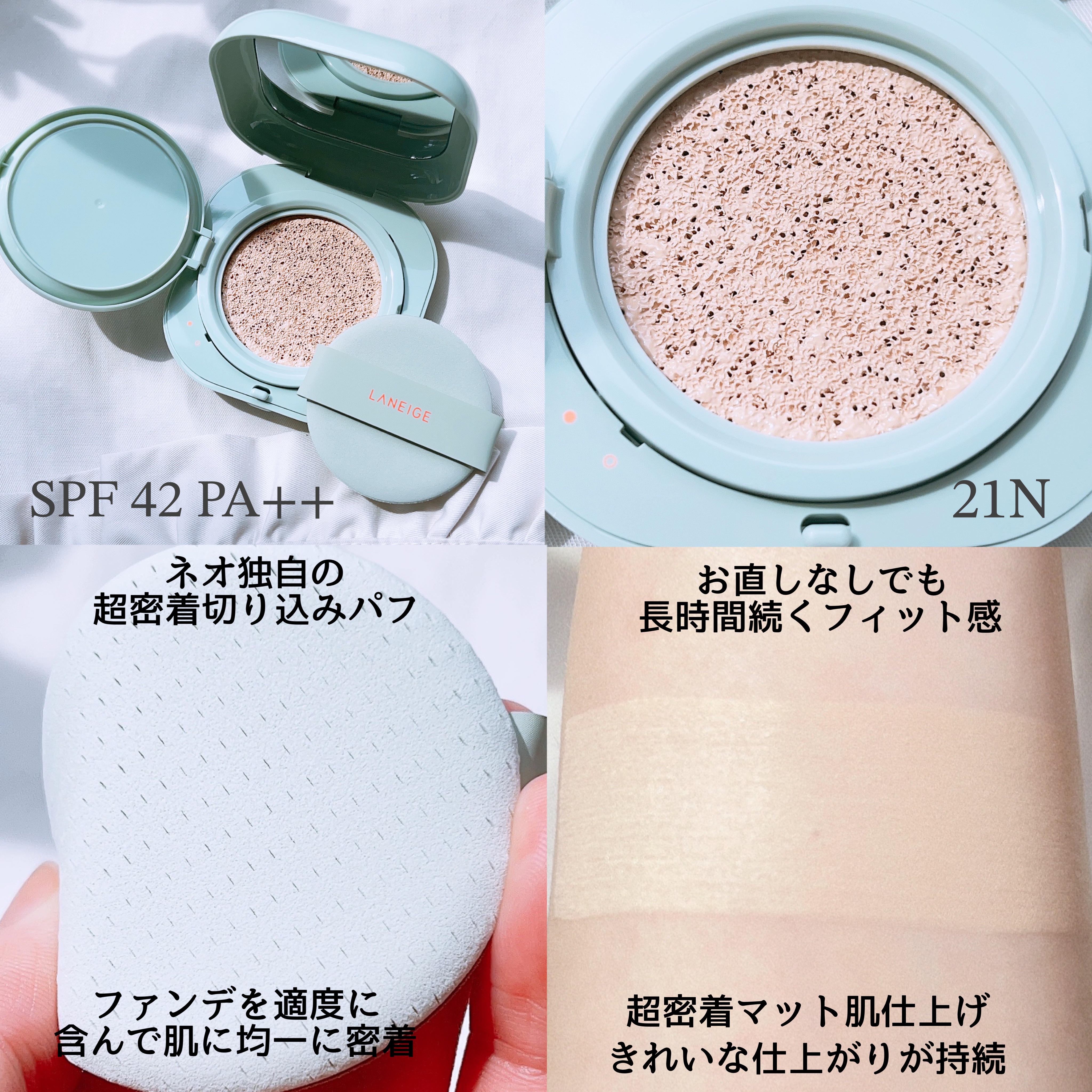 - 肌にぴたっと密着することで、24時間*¹崩れにくい ナチュラルマット肌に仕上げる世界中で大人気のクッションファンデーション *¹当社調べ、個人差があります。 1.VIVID COVERAGE ™(ヴィヴィッドカバレッジ) 技術を採用 LANEIGEクッション史上最も小さいパウダーが、 しっかりカバーなのに重くなく、軽い付け心地とナチュラルな仕上がりを実現しました。 塗りなおしても厚塗り感がなく、カラーメイクをさらにひきたてます。 2.高い密着力を実現したStrong Fixing Formula™ (ストロングフィクシングフォーミュラー )技術を採用し、 皮脂や汗に強くマスクやスマートフォンにも ファンデーションがつきにくい肌に仕上げます 3.皮脂コントロールパウダー配合で汗や皮脂による崩れを防ぎ、 肌のうるおいを閉じ込め乾燥しずらい、ナチュラルなセミマット肌を実現します。 4.アモーレパシフィック初のブルーライトカット効果採用のクッション スマフォやPCといった電子機器、LEDや蛍光灯から発せられるあらゆるブルーライトから肌をプロテクトします。