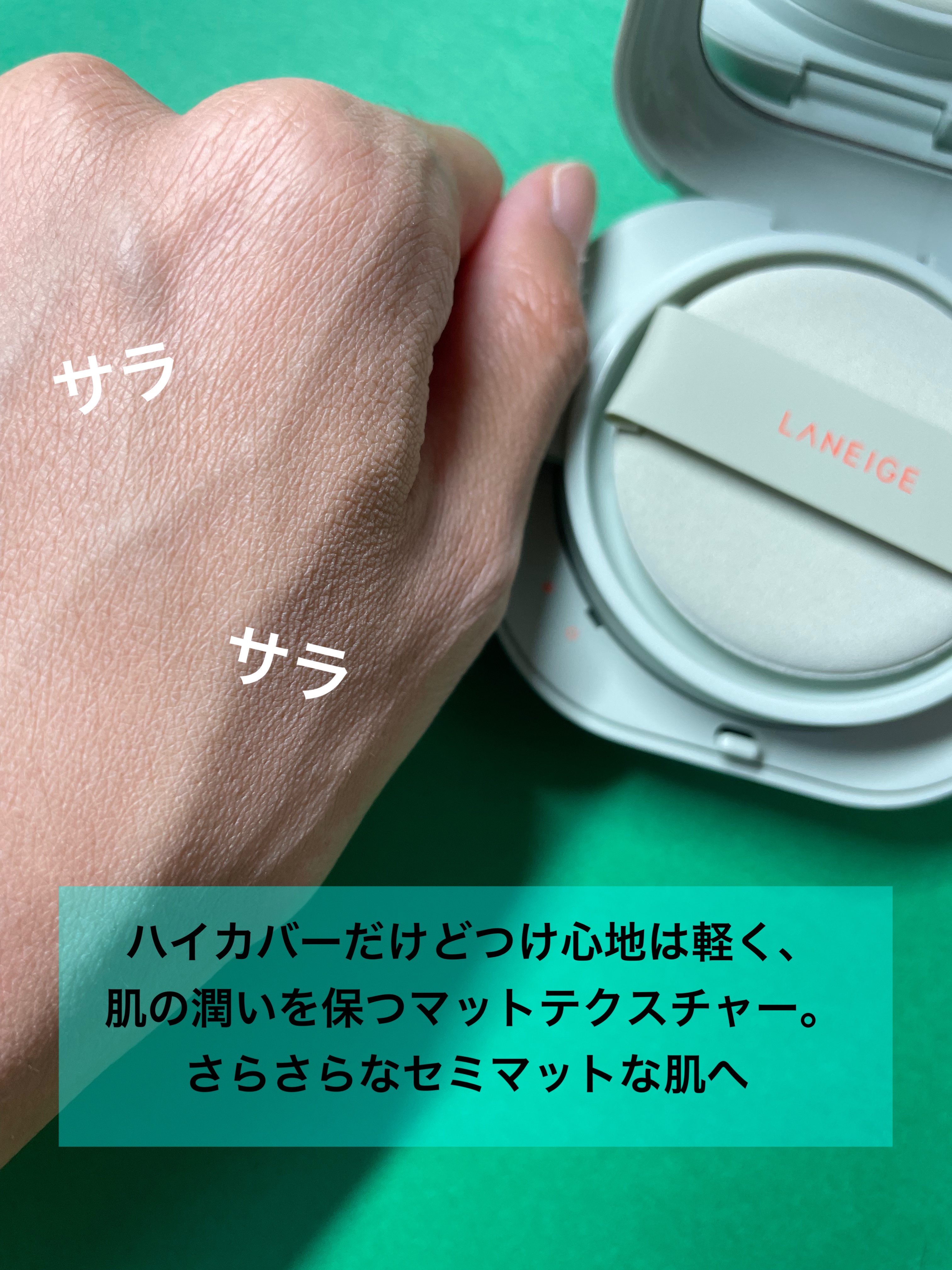 - 肌にぴたっと密着することで、24時間*¹崩れにくい ナチュラルマット肌に仕上げる世界中で大人気のクッションファンデーション *¹当社調べ、個人差があります。 1.VIVID COVERAGE ™(ヴィヴィッドカバレッジ) 技術を採用 LANEIGEクッション史上最も小さいパウダーが、 しっかりカバーなのに重くなく、軽い付け心地とナチュラルな仕上がりを実現しました。 塗りなおしても厚塗り感がなく、カラーメイクをさらにひきたてます。 2.高い密着力を実現したStrong Fixing Formula™ (ストロングフィクシングフォーミュラー )技術を採用し、 皮脂や汗に強くマスクやスマートフォンにも ファンデーションがつきにくい肌に仕上げます 3.皮脂コントロールパウダー配合で汗や皮脂による崩れを防ぎ、 肌のうるおいを閉じ込め乾燥しずらい、ナチュラルなセミマット肌を実現します。 4.アモーレパシフィック初のブルーライトカット効果採用のクッション スマフォやPCといった電子機器、LEDや蛍光灯から発せられるあらゆるブルーライトから肌をプロテクトします。