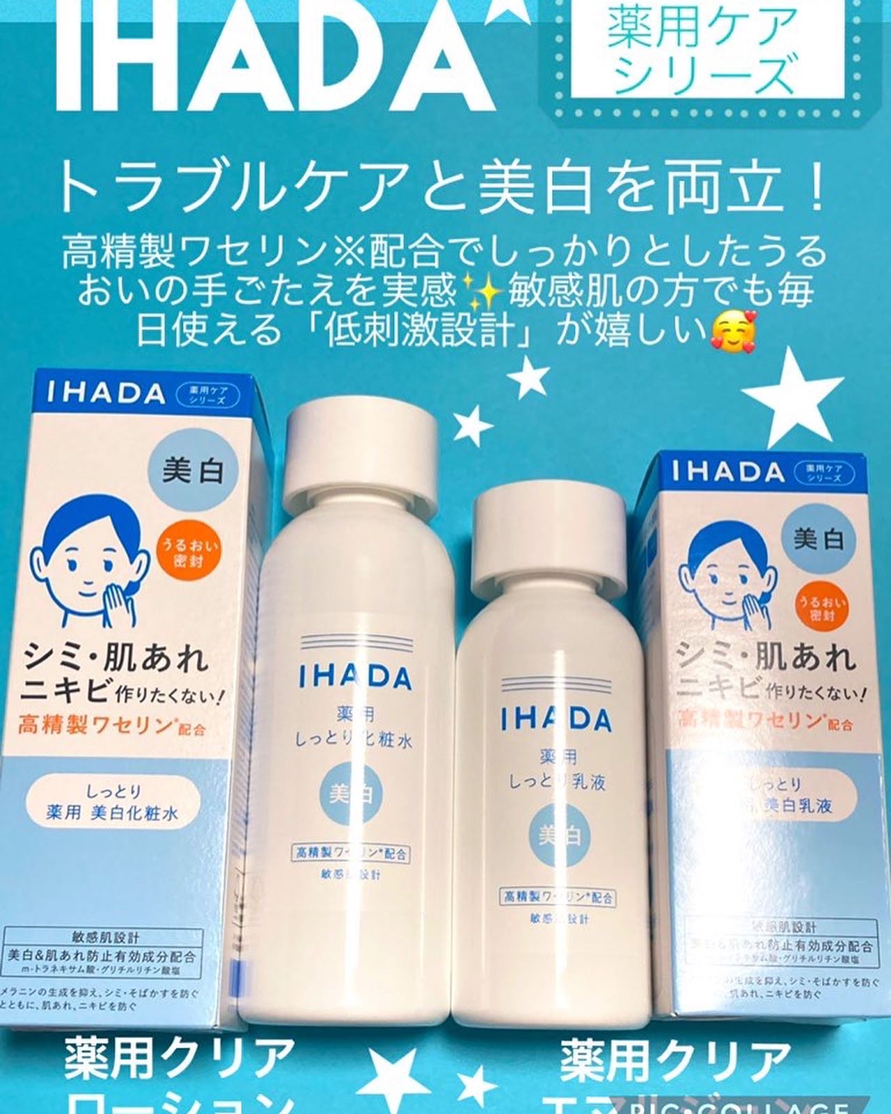 イハダ薬用クリアローション薬用クリアエマルジョン敏感肌やトラブルリスク肌向けに設計された化粧水&乳液♪高精製ワセリン配合で瞬時にうるおい保護膜を形成し、乾燥などの外部刺激から肌を守ります。肌の3大悩み(シミ・そばかす、肌荒れ・乾燥、ニキビ)を...