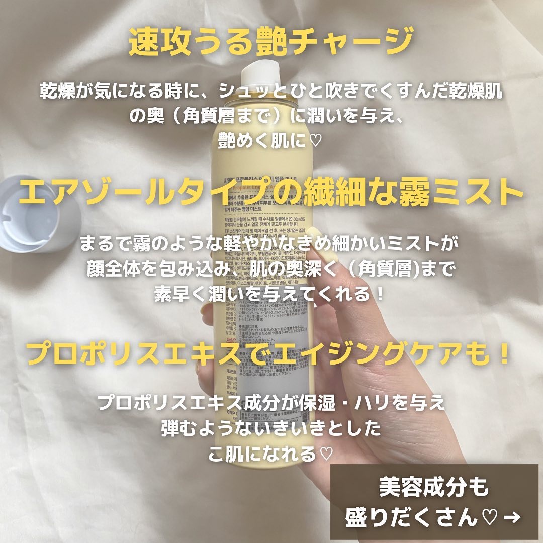 - 長時間うるおいに満ちたツヤ肌へと導くプロポリスエキス成分(保湿)入りミスト状化粧水。 細かい霧状のミストで化粧崩れしにくく、メイクの上から使えます。 化粧水の代わりに使用することもできます。