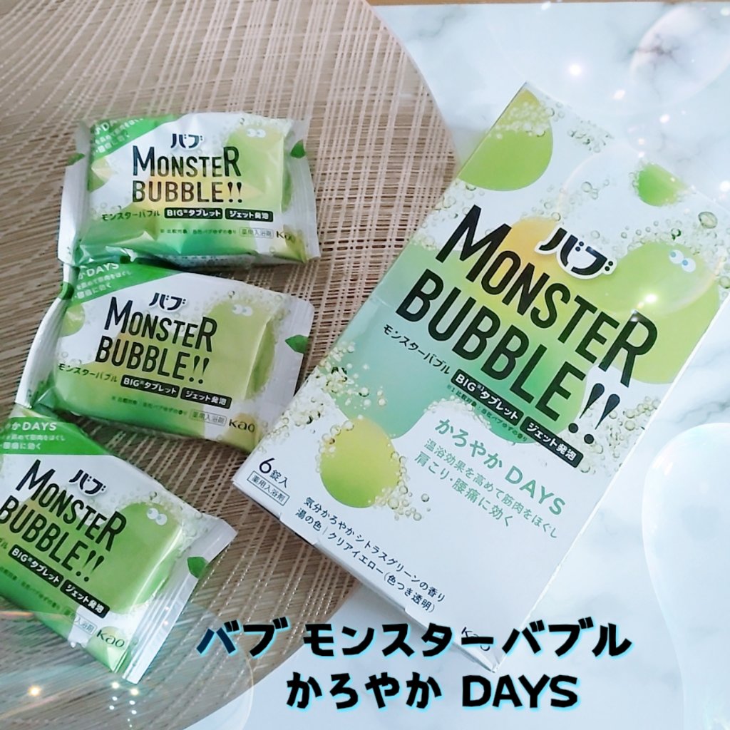 温浴効果を高めて筋肉をほぐし 肩こり・腰痛に効く かろやかDAYS 気分かろやかシトラスグリーンの香り。 シトラスグリーンの爽やかな香りもとても良かったです。全体的な使用感から、「かろやかDAYS」というネーミングは本当にこの商品にピッタリだなと思いました💗 990円で6錠入りなので、同じ値段で4個入りのモンスターバブルMEGA級と比較すると少しお安め。