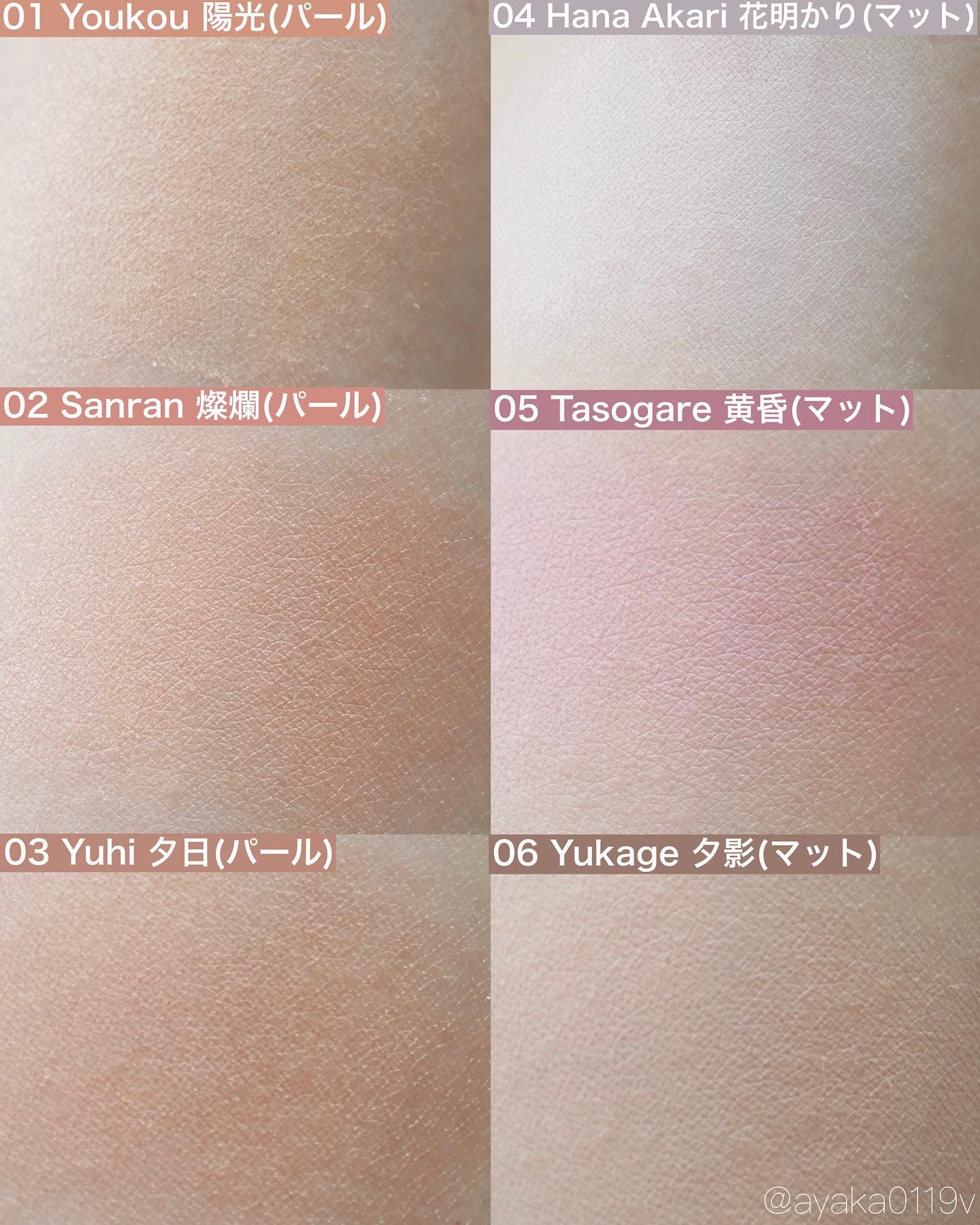 - #01 Youkou マイカ、トリエチルヘキサノイン、シリカ、合成ワックス、リンゴ酸ジイソステアリル、ヘキサ(ヒドロキシステアリン酸/ステアリン酸/ロジン酸)ジペンタエリスリチル、セスキイソステアリン酸ソルビタン、エチルヘキシルグリセリン、メチルパラベン、酢酸トコフェロール、フェノキシエタノール、(+/-)酸化チタン、合成フルオロフロゴパイト、ステアリン酸亜鉛、酸化鉄、黄5、ホウケイ酸(Ca/Na)、赤201、酸化スズ #02 Sanran マイカ、トリエチルヘキサノイン、シリカ、合成ワックス、リンゴ酸ジイソステアリル、ヘキサ(ヒドロキシステアリン酸/ステアリン酸/ロジン酸)ジペンタエリスリチル、セスキイソステアリン酸ソルビタン、エチルヘキシルグリセリン、メチルパラベン、酢酸トコフェロール、フェノキシエタノール、(+/-)酸化チタン、合成フルオロフロゴパイト、ステアリン酸亜鉛、酸化鉄、黄5、ホウケイ酸(Ca/Na)、赤201、酸化スズ #03 Yuhi マイカ、トリエチルヘキサノイン、シリカ、合成ワックス、リンゴ酸ジイソステアリル、ヘキサ(ヒドロキシステアリン酸/ステアリン酸/ロジン酸)ジペンタエリスリチル、セスキイソステアリン酸ソルビタン、エチルヘキシルグリセリン、メチルパラベン、酢酸トコフェロール、フェノキシエタノール、(+/-)酸化チタン、合成フルオロフロゴパイト、ステアリン酸亜鉛、酸化鉄、黄5、ホウケイ酸(Ca/Na)、赤201、酸化スズ #04 Hana Akari マイカ、トリエチルヘキサノイン、タルク、シリカ、カオリン、ヘキサ(ヒドロキシステアリン酸/ステアリン酸/ロジン酸)ジペンタエリスリチル、エチルヘキシルグリセリン、ジメチコン、トリエトキシカプリリルシラン、酢酸トコフェロール、フェノキシエタノール、(+/-)酸化チタン、酸化鉄、赤201、カルミン、黄5 #05 Tasogare マイカ、トリエチルヘキサノイン、タルク、シリカ、カオリン、ヘキサ(ヒドロキシステアリン酸/ステアリン酸/ロジン酸)ジペンタエリスリチル、エチルヘキシルグリセリン、ジメチコン、トリエトキシカプリリルシラン、酢酸トコフェロール、フェノキシエタノール、(+/-)酸化チタン、酸化鉄、赤201、カルミン、黄5 #06 Yukage マイカ、トリエチルヘキサノイン、タルク、シリカ、カオリン、ヘキサ(ヒドロキシステアリン酸/ステアリン酸/ロジン酸)ジペンタエリスリチル、エチルヘキシルグリセリン、ジメチコン、トリエトキシカプリリルシラン、酢酸トコフェロール、フェノキシエタノール、(+/-)酸化チタン、酸化鉄、赤201、カルミン、黄5