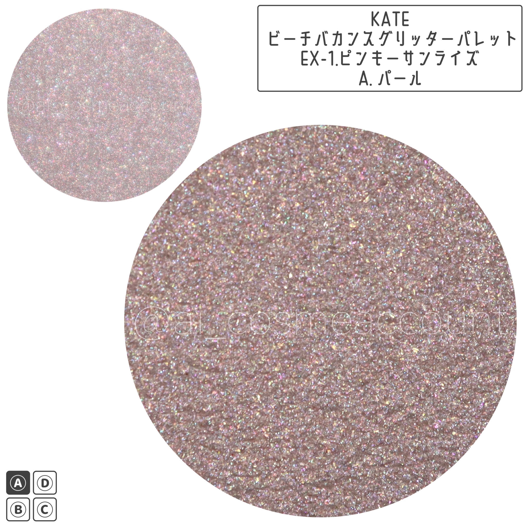 - 【数量限定発売】 きらめく水面のような輝きで目元の存在感を高めるオールきらめきパレットアイシャドウ ◆異なる輝きの組み合わせ A:ツヤと透明感小粒のパール質感 B:しっとりとした発色の繊細パール質感のクリーミータッチ C:存在感のある大粒ハイパーグリッター質感 D:3種の異なる色と輝きで揺らめくミックスグリッター質感 ◆全3種 ■パレット右側2色に採用「ハイパーグリッター処方」 ✓密着力が高い!:密着性の高いオイルを配合。パールが落ちにくい。 ✓見た目の輝度が高い!:油剤を多く、パールを高配合*することで、強い光沢感・グリッター質感を演出。 *自社従来のパール処方と比較して。