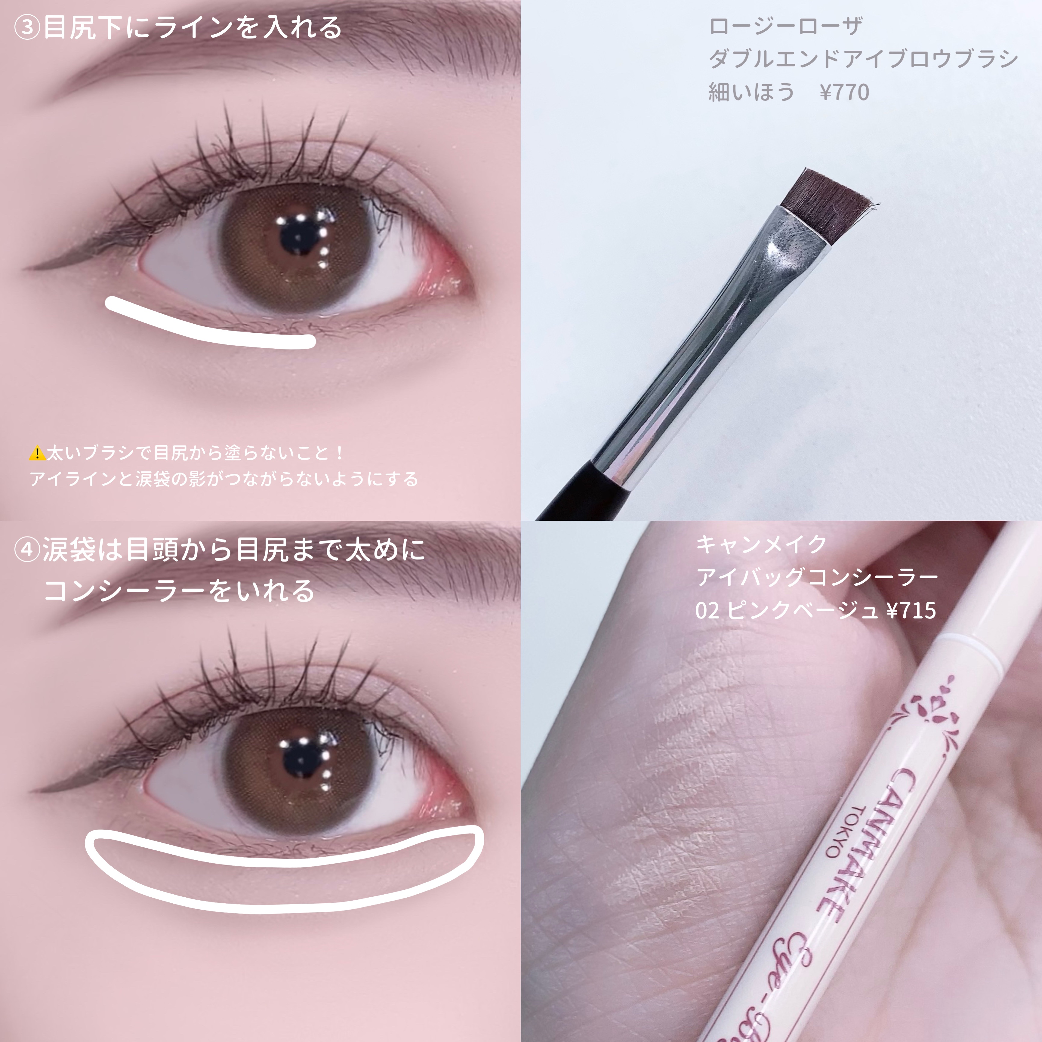 ・涙袋の影の部分まで、ベースを塗ることで縦幅がかなり強調されて丸目にみえる! ・アイシャドウの陰影とラメのハイライト効果で奥まった目に光を取り込んで出目っぽくみせる! ・淡いピンクのアイシャドウ、艶のようなラメ、細くて短いブラックアイラインが特徴 ・つり目を自然にいかせて、美人な雰囲気になれる! ・単色メイクは簡単そうに見えて難しいけど、ブラシを使うと綺麗なグラデーションになる! ・目の形によって中間色をどこまで入れるか変わるけど「目を開けた時に5mm見える」を基準にする