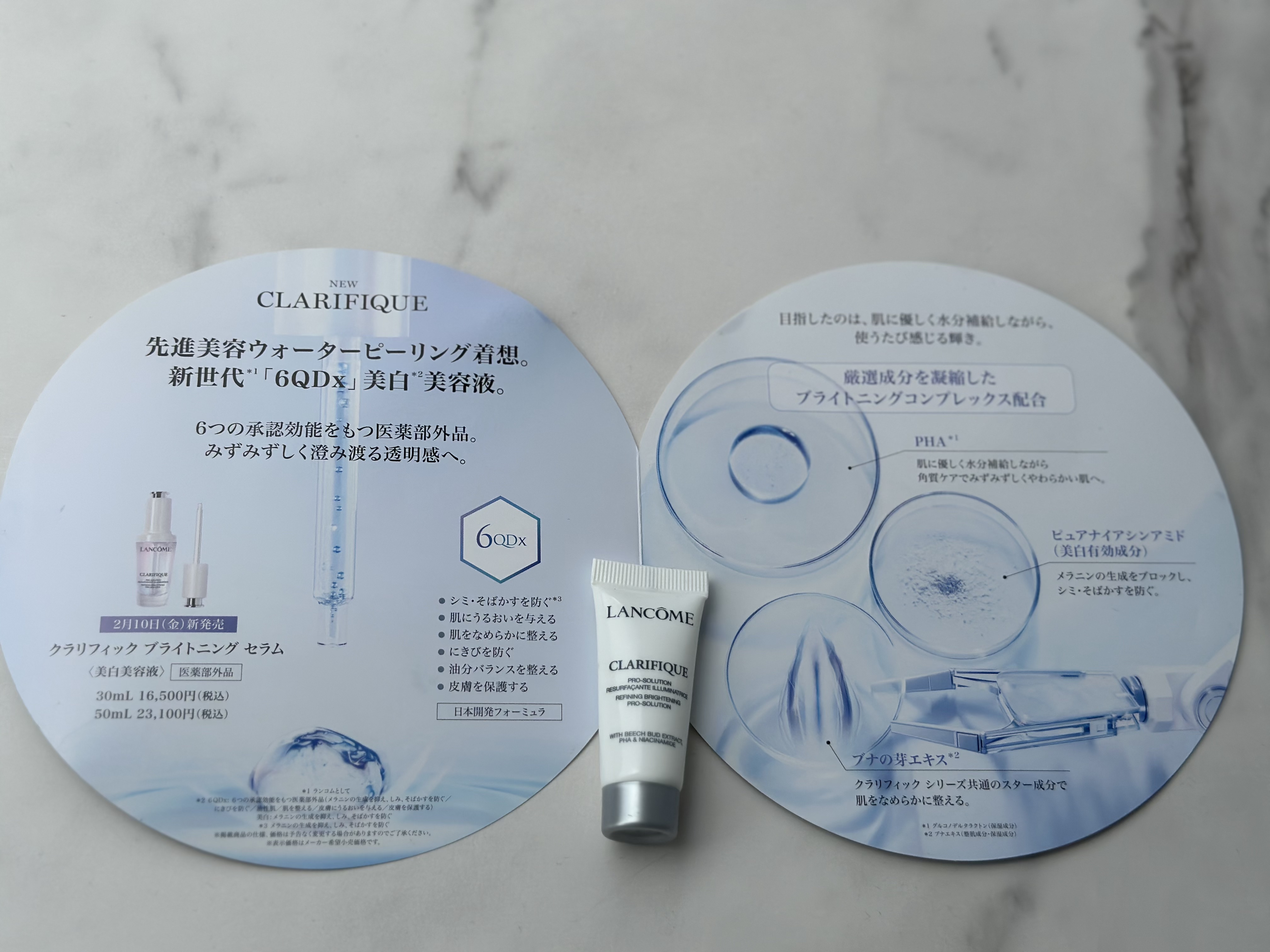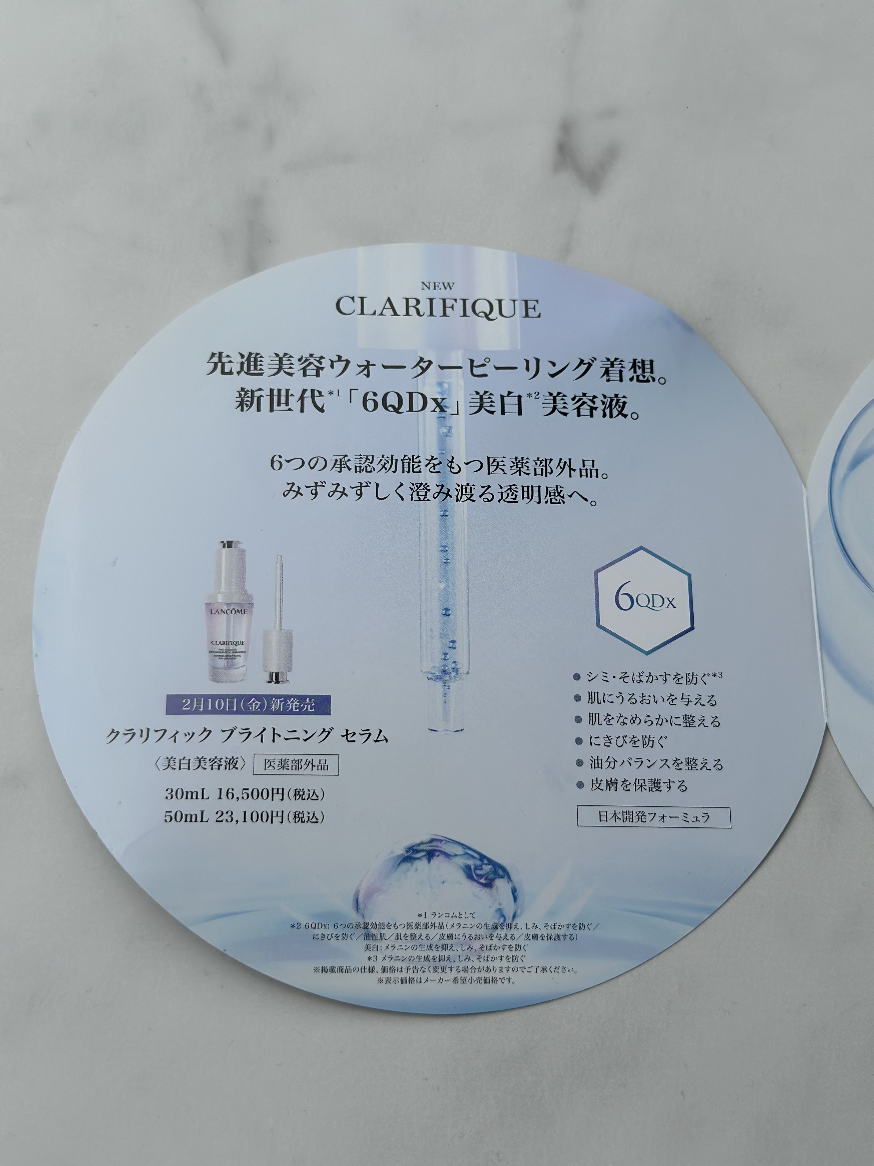- 【医薬部外品】 先進美容ウォーターピーリング着想。 新世代*1「6QDx」美白*2美容液。 6つの承認効能をもつ医薬部外品。みずみずしく澄み渡る透明感へ。 先進美容「ウォーターピーリング」着想で、 目指したのは、肌に優しく水分補給しながら、使うたび感じる輝き。 シミ対策にとどまらず。360°透明肌*3へ。 6つの承認効能をもつ医薬部外品。 シミやくすみ*4が晴れたような、澄みわたる透明感を。 厳選成分を配合したブライトニングコンプレックス。 「PHA」*5肌に優しく水分補給しながら角質ケアでみずみずしくやわらかい肌へ。 「ナイアシンアミド」(美白有効成分)メラニンの生成をブロックし、シミ・そばかすを防ぐ。 「ブナエキス」*6クラリフィック共通成分で肌をなめらかに整える。 6つの効果を1本で。 -シミ・そばかすを防ぐ*7 -肌にうるおいを与える -肌をなめらかに整える -にきびを防ぐ -油分バランスを整える -皮膚を保護する ・日本開発フォーミュラ ・敏感肌でも使える*8 ・アジア人の肌テスト済み*8 *1 ランコムとして *2 6QDx: 6つの承認効能をもつ医薬部外品 (メラニンの生成を抑え、しみ、そばかすを防ぐ/にきびを防ぐ/油性肌/肌を整える/皮膚にうるおいを与える/皮膚を保護する) 美白:メラニンの生成を抑え、しみ、そばかすを防ぐ *3 透明感のある肌のこと *4 乾燥による *5 グルコノデルタラクトン(保湿成分) *6 ブナエキス(整肌成分・保湿成分) *7 メラニンの生成を抑え、しみ、そばかすを防ぐ *8 すべての人に肌トラブルが起きないわけではありません