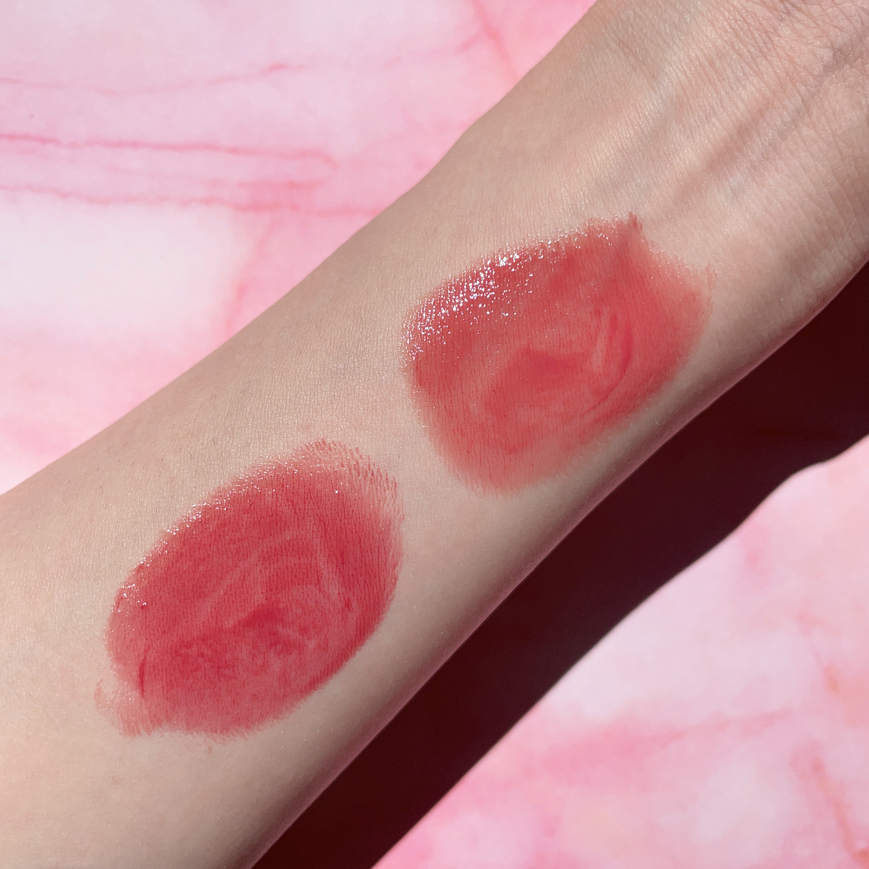 ベタつきや重さがなく軽い付け心地! 透け感があるので、サッと塗っても良い感じに仕上がるのが良すぎる〜!! 唇だと手元のスウォッチよりまろやか&ややピンク寄りに発色されます。 どのカラーもピンク系の着色に感じました。 桃のような甘くてフルーティーな香りがします。 丸みのあるパケ&透明なキャップが可愛い🫶🏻