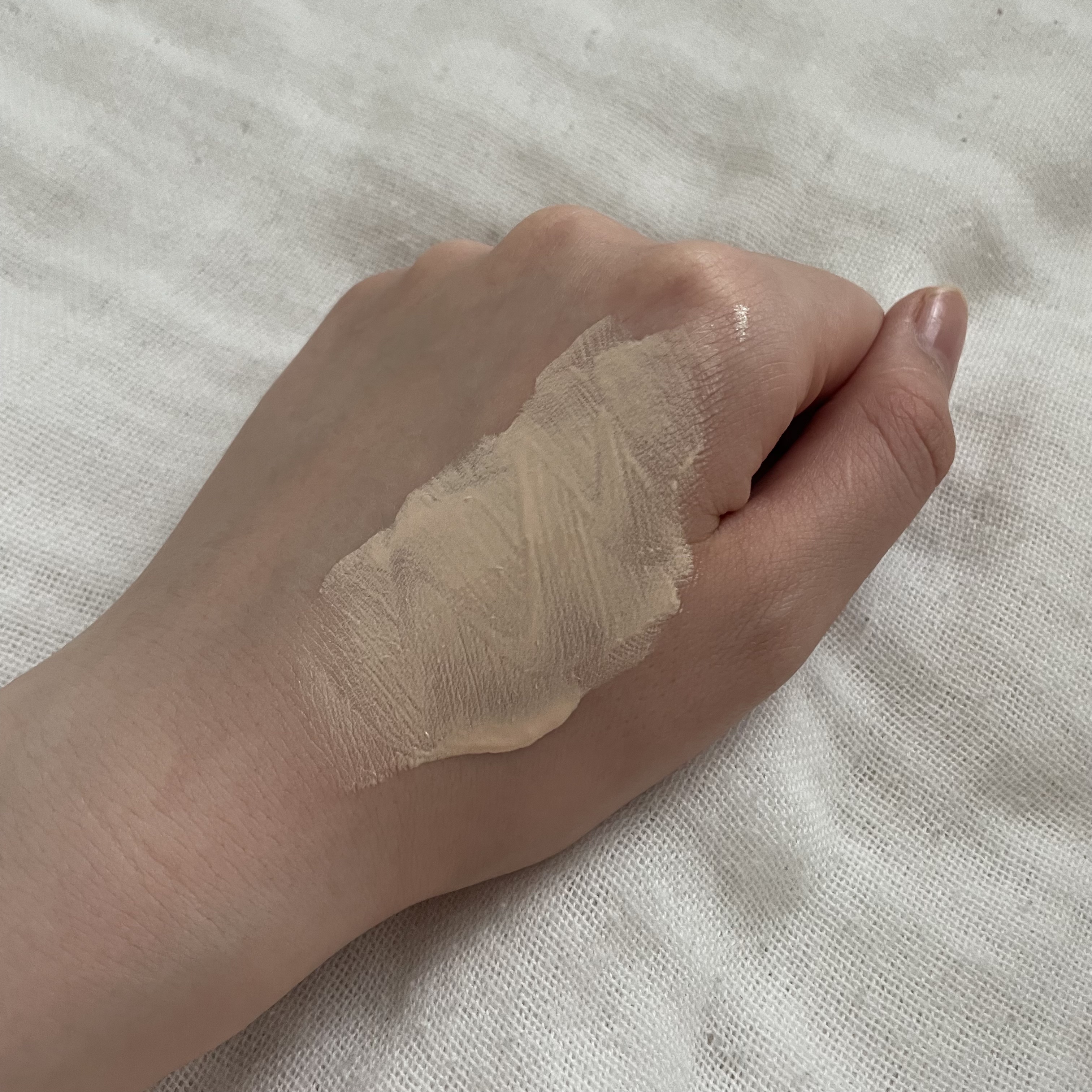 手にとってみた時のテクスチャーは既存のウォータースプラッシュサンクリームと比べると若干重めに感じましたが、肌に馴染ませると変わらず伸びが良いです! まず試しに手に塗ってみた時点で自然なツヤ感とトーンアップ効果に感動✨✨ファンデせずにこれだけでも肌を綺麗に見せてくれます! もちろん顔にも使ってみましたが、セラミド、ペプチド配合で保湿力もアップしたとのことでしたが、朝塗って夜まで乾燥が気になりませんでした! 皮膚科テスト完了、ヴィーガン認証もされているので、敏感肌でも安心して使えます。 そして、既存のタイプに比べてマイルドな香りになった気がします!私は前の香りも好きでしたが、こちらはさらにふんわりとやさしく香ります。