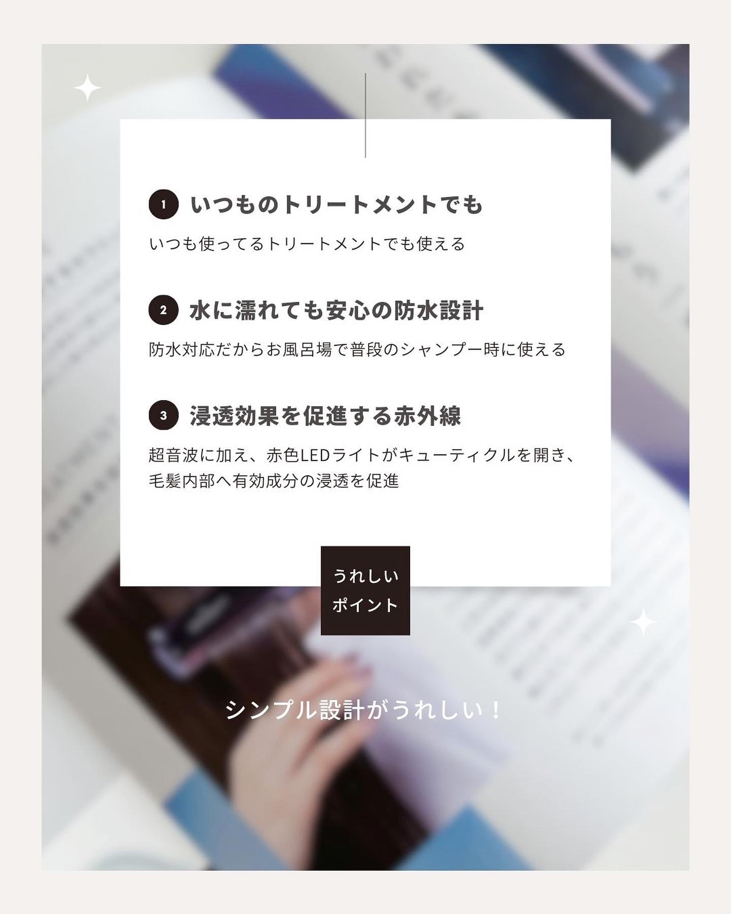 - 美容における超音波プレートの有効性に着眼。世界クオリティの超音波プレート製造会社との共同開発により、有効成分をナノレベルに粒子化し、髪への浸透性を促進させる超音波プレートを搭載したトリートメント浸透促進器。