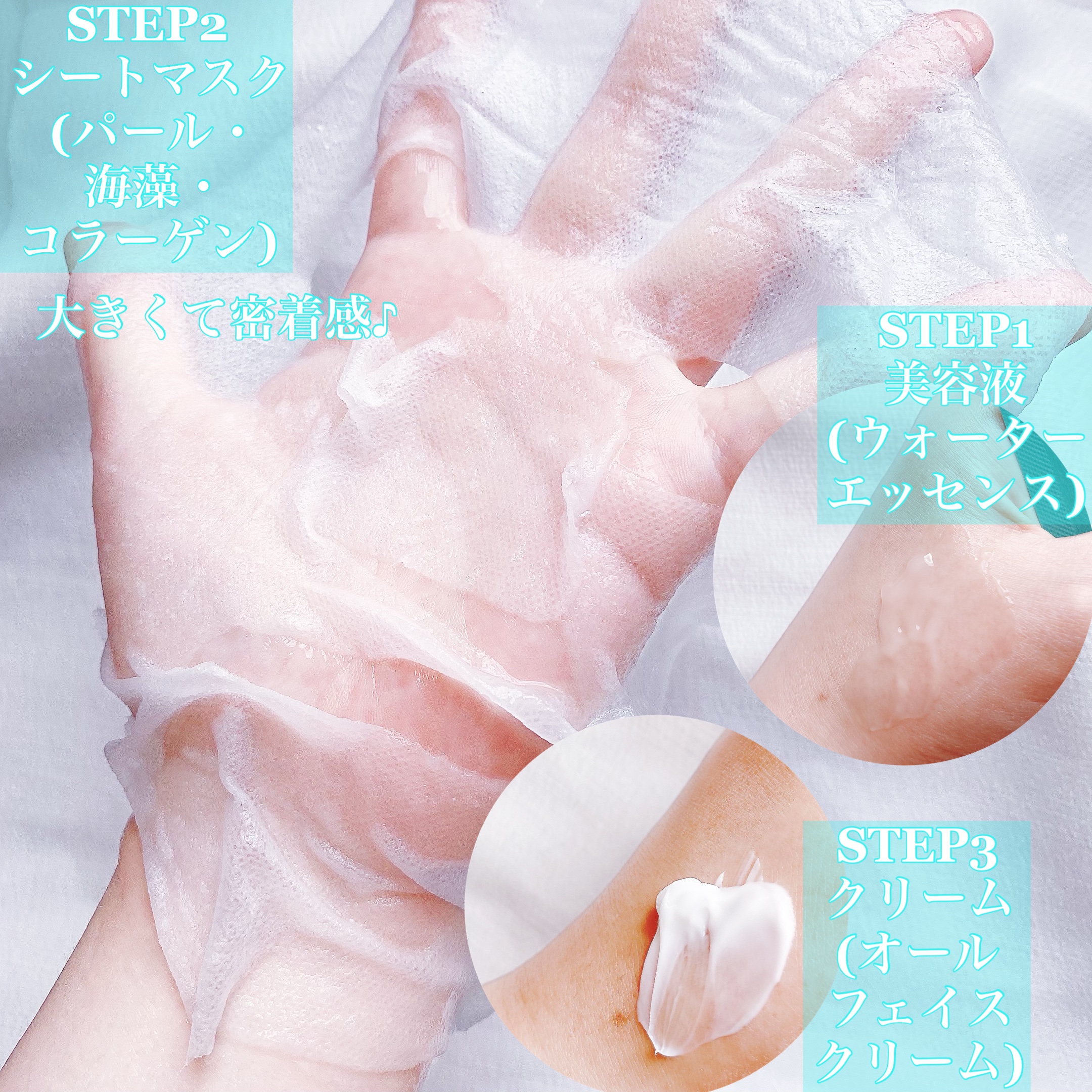 3種のヒアルロン酸(①水分保持②保湿ケア③肌のバリア機能ケア)とパールエキス(肌のキメをなめらかにしてくれる)配合の導入美容液、シートマスク、フェイスクリームの3ステップでスキンケアが完了する万能アイテム! シートマスクは柔らかく、肌にピタッと密着してしっかり保湿しハリ、弾力のある肌にしてくれます✨ 旅行先のホテルって、よく乾燥しているので荷物も減らせてスペシャルケアが叶うこちらのシートマスクは本当にありがたい🙏