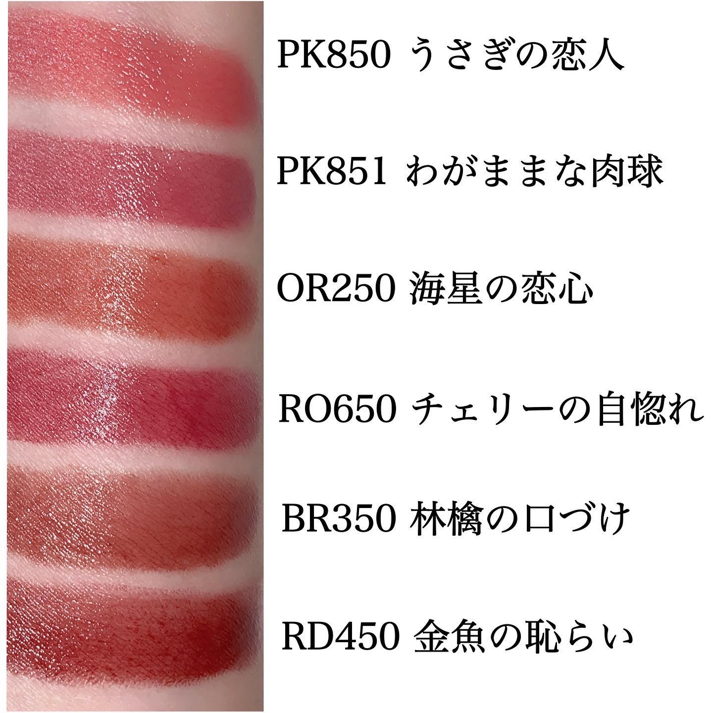 - <BR350 林檎の口づけ> ジフェニルジメチコン、デカエチルヘキサン酸ポリグリセリル-10、(ビニルピロリドン/ヘキサデセン)コポリマー、イソドデカン、トリメチルシロキシフェニルジメチコン、テトラエチルヘキサン酸ペンタエリスリチル、トリイソステアリン酸ポリグリセリル-2、合成ワックス、ジメチコン、フェニルトリメチコン、イソステアリン酸デキストリン、DPG、トコフェロール、ヒアルロン酸Na、BHT、(エイコセン/ビニルピロリドン)コポリマー、(エチレン/プロピレン)コポリマー、アルミナ、カルナウバロウ、キャンデリラロウ、キャンデリラロウエステルズ、シリカ、ジメチルシリル化シリカ、スクワラン、ハイドロゲンジメチコン、炭酸Ca、酸化チタン、酸化鉄、黄4、赤202 <BR352 駆け引きワイン(限定)> ジフェニルジメチコン、デカエチルヘキサン酸ポリグリセリル-10、(VP/ヘキサデセン)コポリマー、イソドデカン、トリメチルシロキシフェニルジメチコン、テトラエチルヘキサン酸ペンタエリスリチル、合成ワックス、ジメチコン、フェニルトリメチコン、トリイソステアリン酸ポリグリセリル-2、イソステアリン酸デキストリン、DPG、トコフェロール、ヒアルロン酸Na、BHT、(エイコセン/ビニルピロリドン)コポリマー、(エチレン/プロピレン)コポリマー、アルミナ、カルナウバロウ、キャンデリラロウ、キャンデリラロウエステルズ、シリカ、ジメチルシリル化シリカ、スクワラン、ハイドロゲンジメチコン、炭酸Ca、酸化チタン、酸化鉄、黄4、赤202 <OR250 海星の恋心> ジフェニルジメチコン、デカエチルヘキサン酸ポリグリセリル-10、(ビニルピロリドン/ヘキサデセン)コポリマー、イソドデカン、トリメチルシロキシフェニルジメチコン、トリイソステアリン酸ポリグリセリル-2、テトラエチルヘキサン酸ペンタエリスリチル、合成ワックス、ジメチコン、フェニルトリメチコン、イソステアリン酸デキストリン、DPG、トコフェロール、ヒアルロン酸Na、BHT、(エイコセン/ビニルピロリドン)コポリマー、(エチレン/プロピレン)コポリマー、アルミナ、カルナウバロウ、キャンデリラロウ、キャンデリラロウエステルズ、シリカ、ジメチルシリル化シリカ、スクワラン、ハイドロゲンジメチコン、炭酸Ca、酸化チタン、酸化鉄、黄4、赤202 <PK850 うさぎの恋人> ジフェニルジメチコン、デカエチルヘキサン酸ポリグリセリル-10、(ビニルピロリドン/ヘキサデセン)コポリマー、イソドデカン、トリメチルシロキシフェニルジメチコン、テトラエチルヘキサン酸ペンタエリスリチル、トリイソステアリン酸ポリグリセリル-2、合成ワックス、ジメチコン、フェニルトリメチコン、イソステアリン酸デキストリン、DPG、トコフェロール、ヒアルロン酸Na、BHT、(エイコセン/ビニルピロリドン)コポリマー、(エチレン/プロピレン)コポリマー、アルミナ、カルナウバロウ、キャンデリラロウ、キャンデリラロウエステルズ、シリカ、ジメチルシリル化シリカ、スクワラン、ハイドロゲンジメチコン、炭酸Ca、酸化チタン、酸化鉄、黄4、赤202 <PK851 わがままな肉球> ジフェニルジメチコン、デカエチルヘキサン酸ポリグリセリル-10、(ビニルピロリドン/ヘキサデセン)コポリマー、イソドデカン、トリメチルシロキシフェニルジメチコン、テトラエチルヘキサン酸ペンタエリスリチル、トリイソステアリン酸ポリグリセリル-2、合成ワックス、ジメチコン、フェニルトリメチコン、イソステアリン酸デキストリン、DPG、トコフェロール、ヒアルロン酸Na、BHT、(エイコセン/ビニルピロリドン)コポリマー、(エチレン/プロピレン)コポリマー、アルミナ、カルナウバロウ、キャンデリラロウ、キャンデリラロウエステルズ、シリカ、ジメチルシリル化シリカ、スクワラン、ハイドロゲンジメチコン、炭酸Ca、酸化チタン、酸化鉄、黄4、赤202 <PK852 桜の微笑み> ジフェニルジメチコン、デカエチルヘキサン酸ポリグリセリル-10、(VP/ヘキサデセン)コポリマー、イソドデカン、トリメチルシロキシフェニルジメチコン、テトラエチルヘキサン酸ペンタエリスリチル、合成ワックス、トリイソステアリン酸ポリグリセリル-2、ジメチコン、フェニルトリメチコン、イソステアリン酸デキストリン、DPG、トコフェロール、ヒアルロン酸Na、BHT、(エイコセン/ビニルピロリドン)コポリマー、(エチレン/プロピレン)コポリマー、カルナウバロウ、キャンデリラロウ、キャンデリラロウエステルズ、ジメチルシリル化シリカ、スクワラン、トリイソステアリン酸イソプロピルチタン、ハイドロゲンジメチコン、メチコン、水酸化Al、炭酸Ca、酸化チタン、酸化鉄、黄4、赤202 <PK854 一途なピオニー(限定)> ジフェニルジメチコン、デカエチルヘキサン酸ポリグリセリル-10、(VP/ヘキサデセン)コポリマー、イソドデカン、トリメチルシロキシフェニルジメチコン、テトラエチルヘキサン酸ペンタエリスリチル、トリイソステアリン酸ポリグリセリル-2、合成ワックス、ジメチコン、フェニ