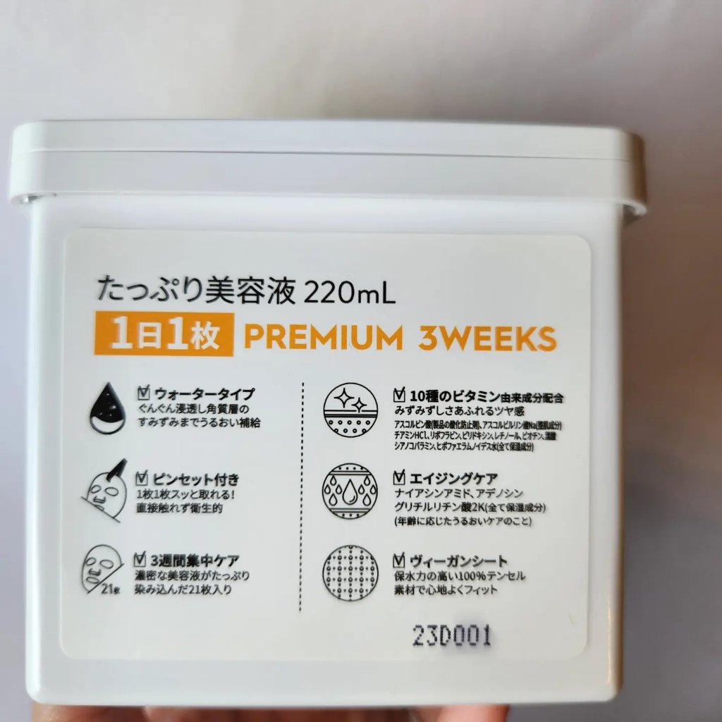 - <21枚> 水、DPG、ナイアシンアミド、グリセリン、メチルプロパンジオール、レチノール、アスコルビン酸、アスコルビルリン酸Na、チアミンHCl、リボフラビン、ピリドキシン、ビオチン、葉酸、シアノコバラミン、ヒポファエラムノイデス水、アラントイン、アデノシン、アルギニン、グリチルリチン酸2K、ヒアルロン酸Na、オレンジ果皮油、BG、ラウリン酸ポリグリセリル10、1,2-ヘキサンジオール、カルボマー、キサンタンガム、トコフェロール、ヒドロキシアセトフェノン、BHT、BHA、ラウリン酸ポリグリセリル-4、ポリソルベート20、EDTA-2Na、リモネン