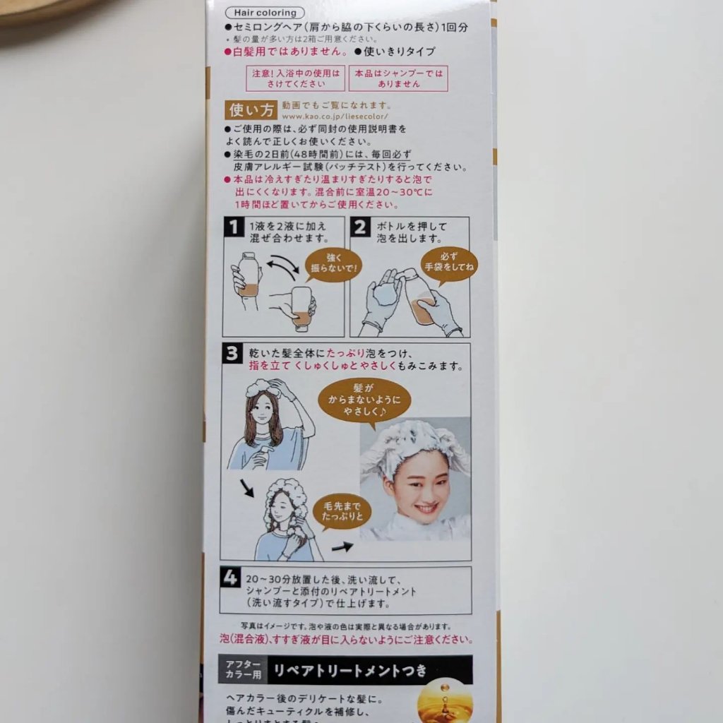 - 【医薬部外品】 【黒髪用ヘアカラー】 泡で簡単! 濃密泡が染まりにくい根元や見えない後ろにもしっかり密着して、ムラなく美しい仕上がりを実現。 透明感とやわらかさを表現するために、グレーやブルーの色味をブレンドした「サロン発想」の色設計。 毛髪保護成分*配合。指通りなめらか、しっとり質感の染め上がり。 *水解シルク液、軟質ラノリン脂肪酸 アフターカラー用リペアトリートメント(化粧品)つき。 ●セミロングヘア(肩から脇の下くらいの長さ)1回分 ●1回使いきりタイプ ●白髪用ではありません ※使用上の注意をよく読んで、正しくお使いください。 ※ヘアカラーでかゆみ、発疹、発赤がでたことのある方は、絶対に使用しないでください。