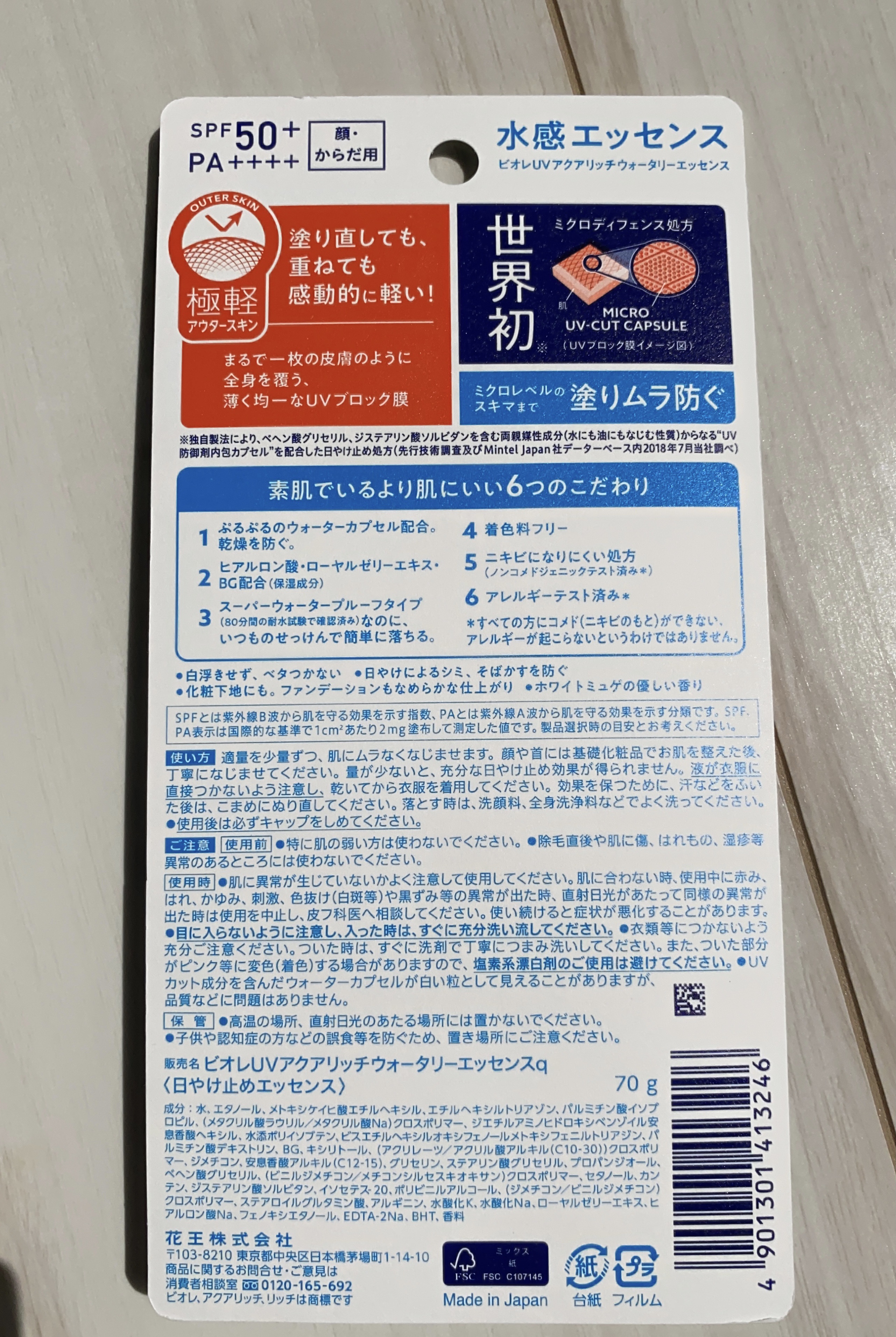 - 塗り直しても、重ねても感動的に軽い!水感UV。ミクロレベルのスキマまで塗りムラ防ぐ。化粧下地にも。ファンデーションもなめらかな仕上がり。日やけによるシミ、そばかすを防ぐ。スーパーウォータープルーフ(80分間の耐水試験で確認済み)。せっけんで落とせる。顔・からだ用。SPF50+/PA++++。白浮きしにくく、ベタつきにくい。ヒアルロン酸・ローヤルゼリーエキス・BG配合(保湿成分)