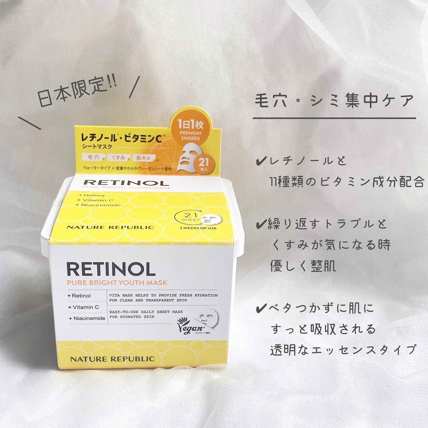 NATUREREPUBLICレチノールピュアブライトユースシートマスク パンテノールハイドラバランスシートマスクプロポリスインテンシブナリシングシートマスク内容量▷▶21枚入り販売価格▶各1,870円(税込)𓈒𓏸𓐍𓂃𓈒𓏸𓂃◌𓈒𓐍𓈒𓈒𓏸𓐍𓂃𓈒𓏸...