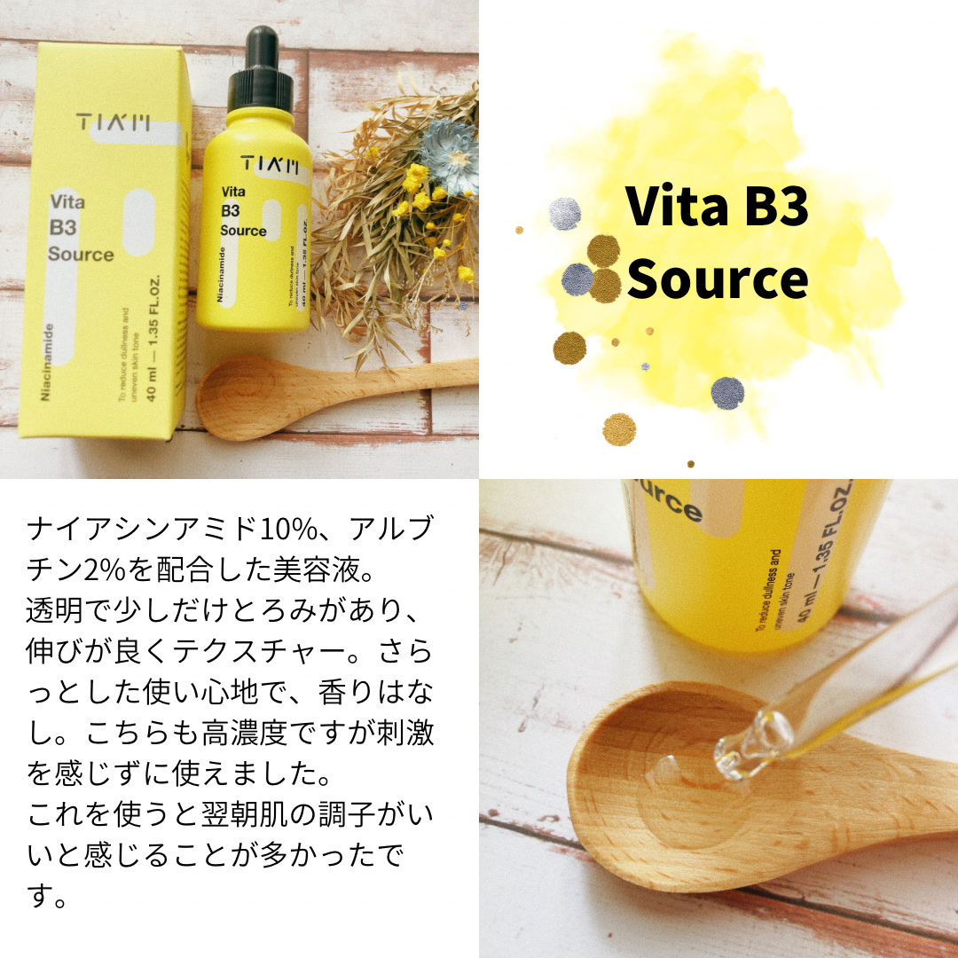TIAMはビタミンA、B、Cとお肌への有効成分をもとに、お肌悩みに合わせたアイテムを展開している韓国スキンケアブランド。 贅沢な成分配合なのに結構リーズナブルな価格。リピしやすいです。 とろみのあるテクスチャーで、肌に乗せてすぐはペタペタした感じがありますが、数秒でヌルつき感は消えてピタッと留まります。