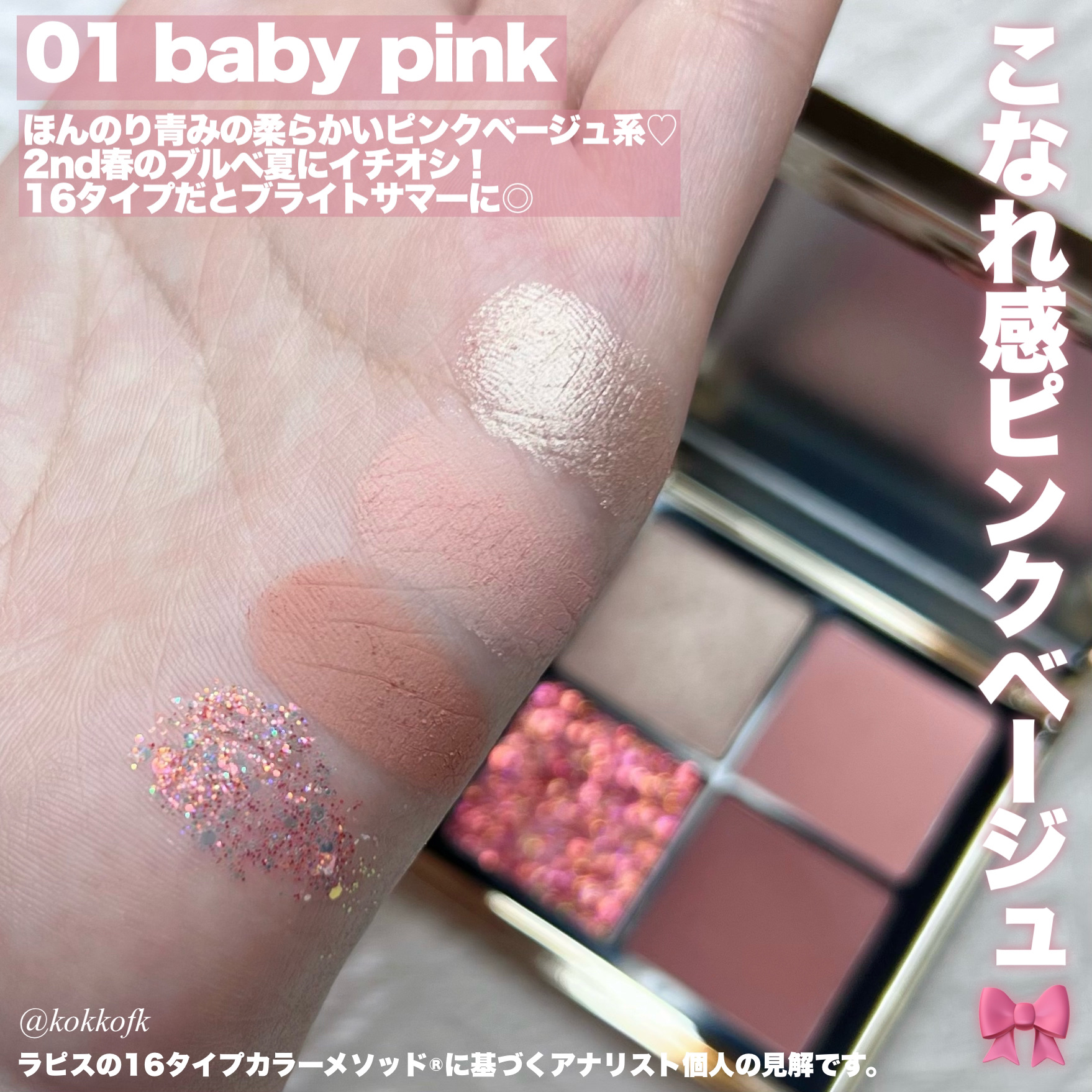高発色で粉質はサラサラ! 01の大粒グリッターはしっとりしていて高密着✨ 01baby pinkは肌馴染みの良いローズカラー🩷 グリッターの使い方次第でメイクが楽しめるよ! 赤のレザー調のパケが高級感あり✨ 全4色、各2300円です。
