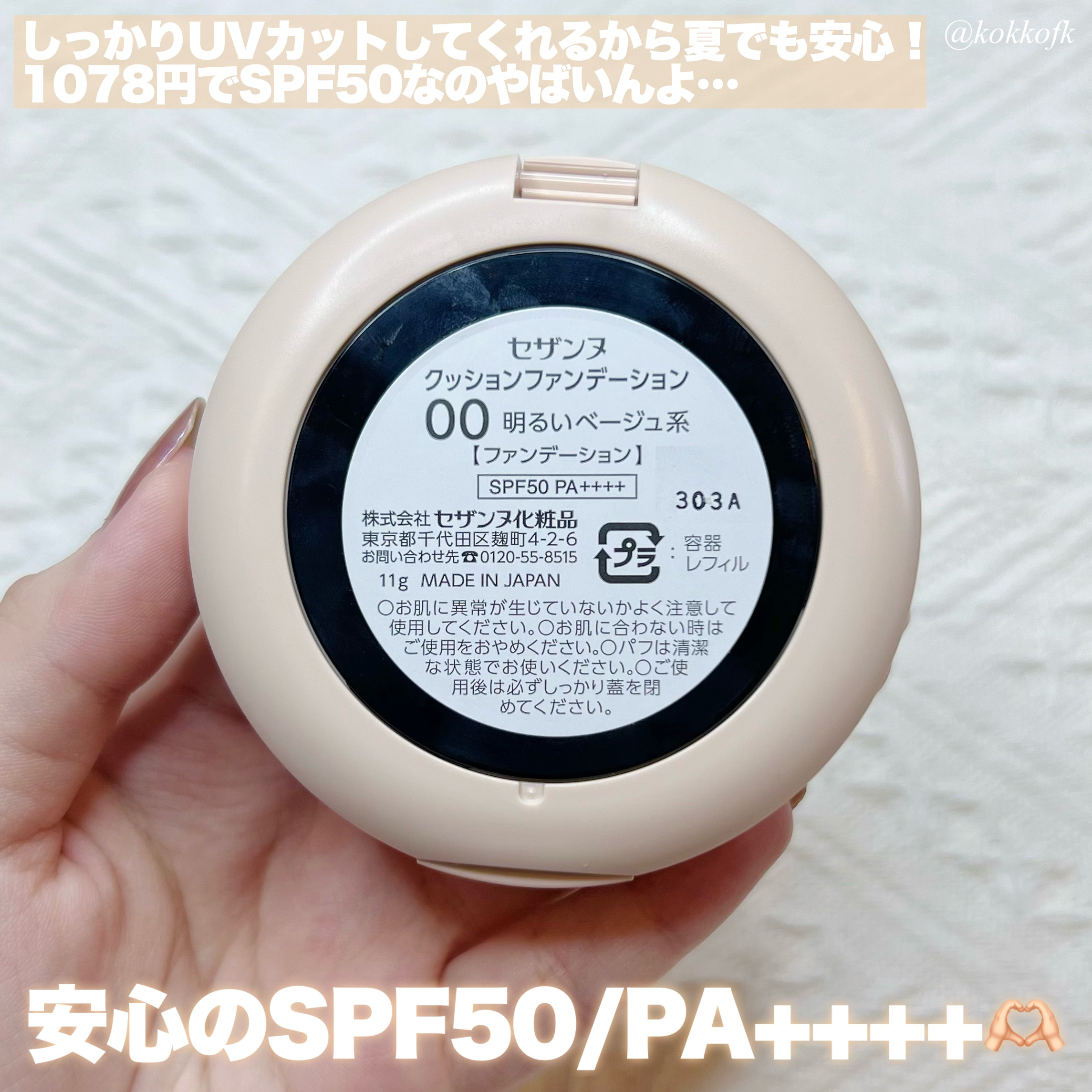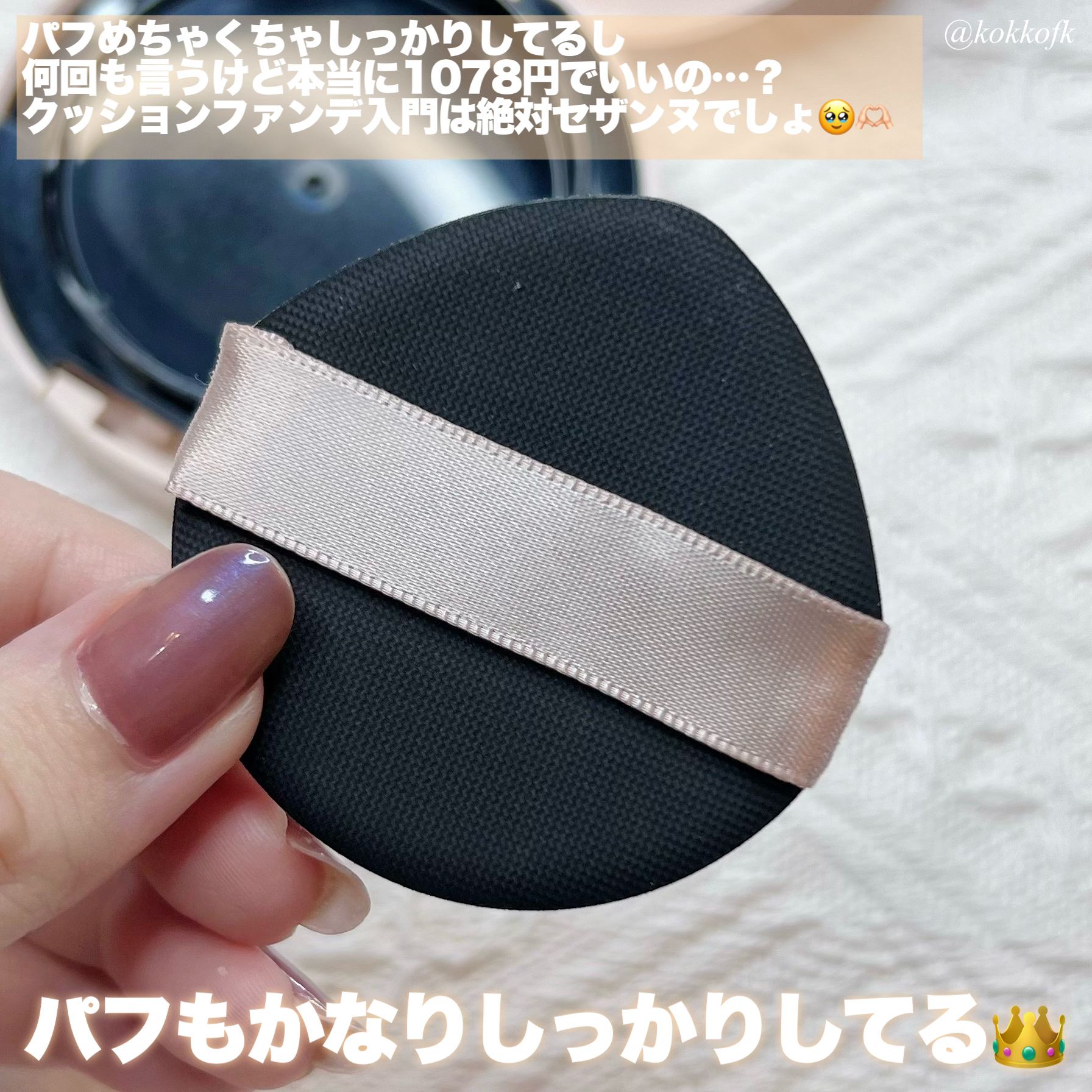 - <本体> 薄膜がぴたっと密着し艶肌続くクッションファンデ。 シミ・毛穴・色ムラをカバーしてお肌にぴたっと密着しメイク崩れしにくい。 5種の保湿成分(スクワラン、セラミドNP、ベルガモット果実エキス、ヒアルロン酸Na、アーチチョーク葉エキス)と高保湿オイルを配合。 重ねても厚塗りになりにくく、まるでお肌の内側から潤ったような艶肌仕上げ。 SPF50 PA++++。 石鹸で落とせます。(※単品使用の場合) <パフ> セザンヌのクッションファンデーションに使える替パフ2個入。 広い面や細部までも使いやすいしずく型パフで、ファンデーションをムラなくきれいに仕上げます。 クッション面にパフを押し当て、ファンデーションを適量とり、軽くたたくようにお肌に塗布してください。 ※汚れたときは、うすめた台所用中性洗剤で軽く押し洗いをし、よく洗い流してください。その後水気を切り、陰干ししてください。