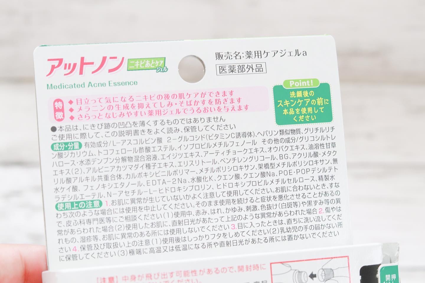 - 医薬部外品 1.目立って気になるニキビのあとに、メラニンの生成を抑える有効成分を配合 5種類※1の有効成分が、ニキビが治った後の肌に働きかけ、ニキビあとの肌トラブルの原因となる炎症やメラニンの生成を抑制し、ニキビ自体の再発も防ぐことできれいな肌に導きます。 また、植物から抽出したエキス※2なども配合しており、ニキビのあとの肌をケアします。 ※1 L-アスコルビン酸 2-グルコシド、ヘパリン類似物質、グリチルリチン酸ジカリウム、トコフェロール酢酸エステル、イソプロピルメチルフェノール、 ※2 エイジツエキス、アーティチョークエキス、オウバクエキス、油溶性甘草エキス(2)、アルピニアカツマダイ種子エキス(いずれも保湿成分) 2.さらっとなじみやすい薬用ジェルで、うるおいを与える さらっとしてベタつかないジェルタイプなので、肌にうるおいを与えながらケアができます。朝晩の洗顔後にお使いいただくことで、有効成分や保湿成分が肌の調子を整え、気になるニキビのあとの奥まで※3しっかりと浸透していきます。 ※3 角質層まで 販売名:薬用ケアジェルa