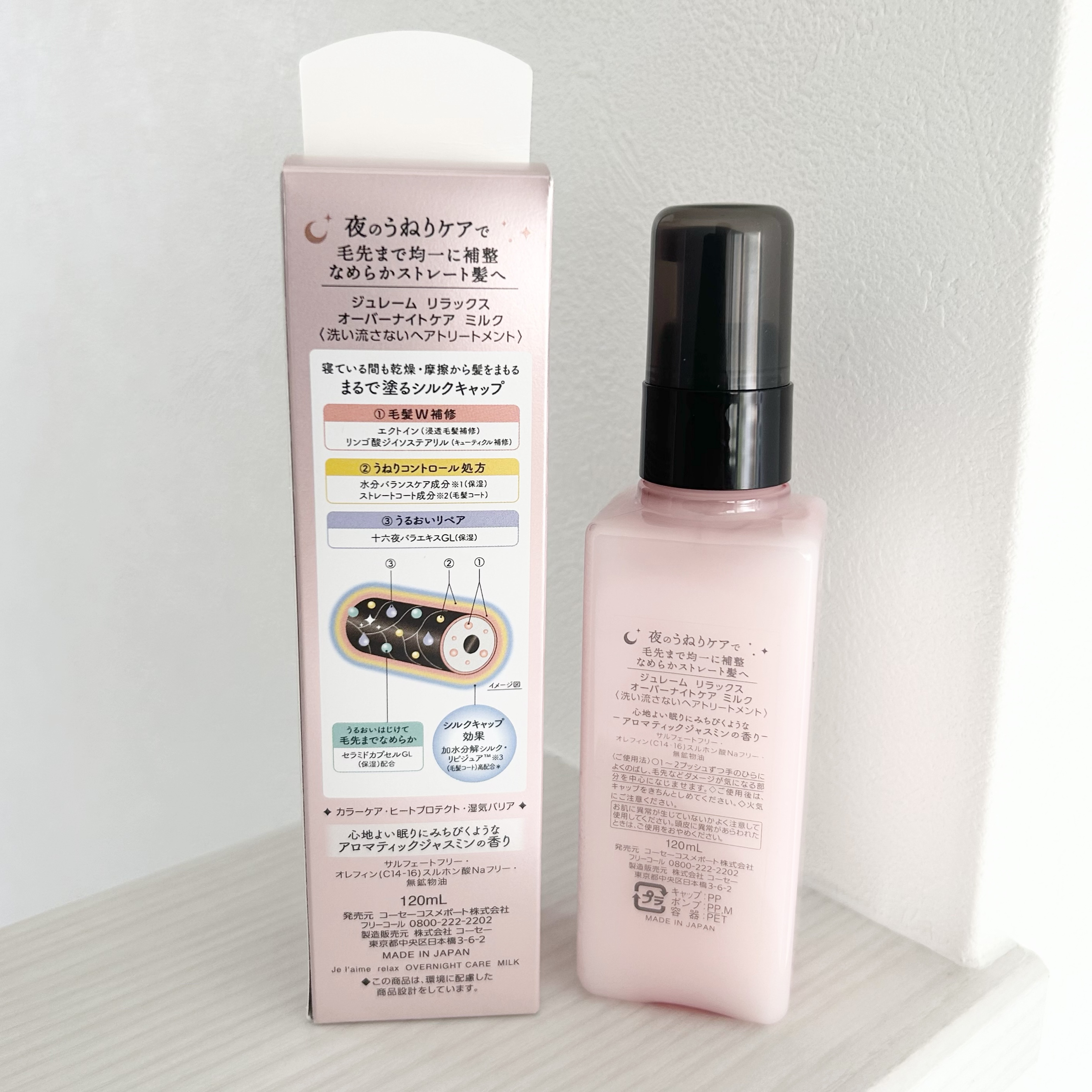 Jel'aimeリラックスオーバーナイトケアミルクポケモンデザイン120ml¥1,320ドンキホーテのセールで980円うねり髪の夜美容。毛先まで均一に補整なめらかストレート。洗い流さないトリートメントだけどサラサラしてます。心地よい眠りに導く...