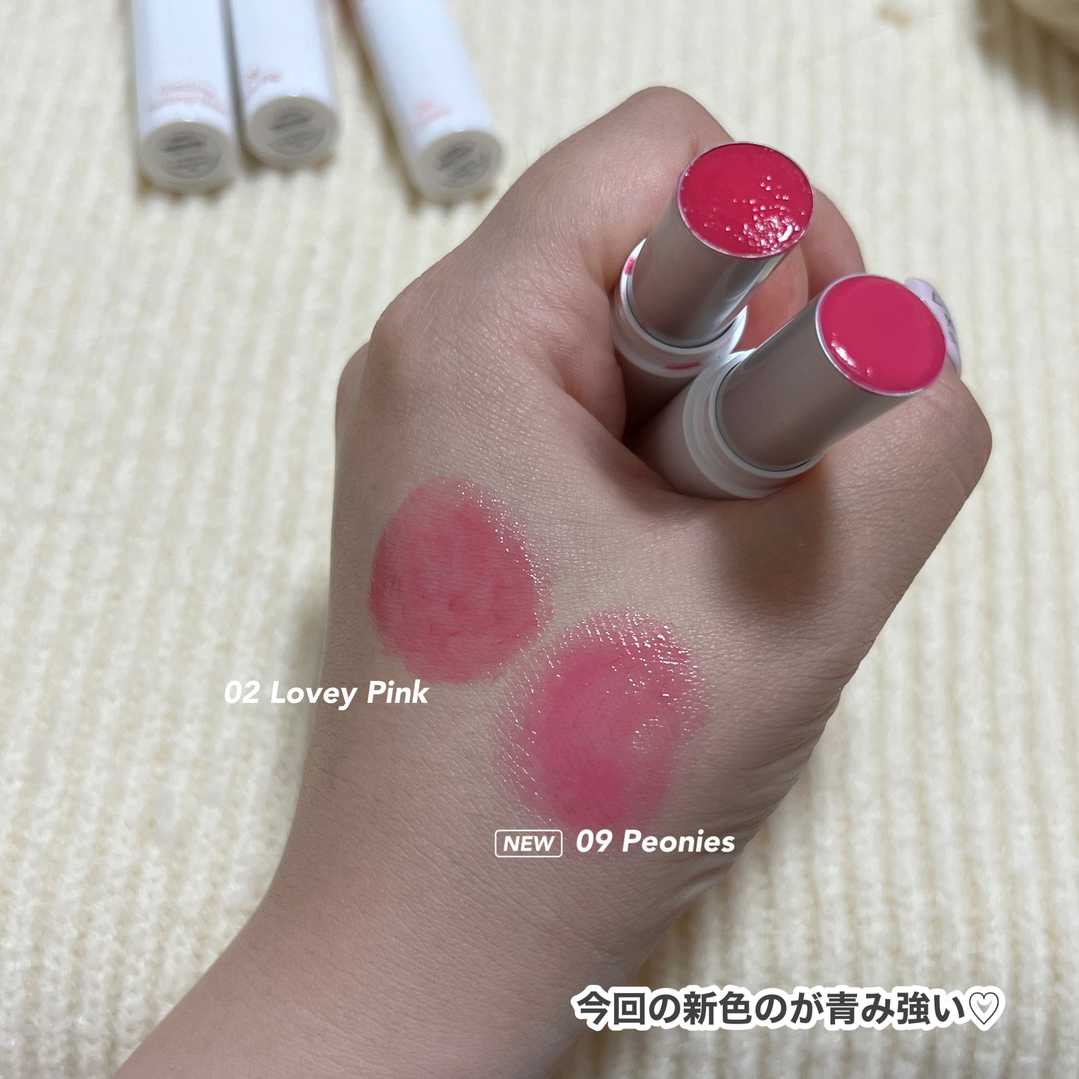 - もちっとした水膜で弾けそうなツヤリップ 1.軽い塗り心地のなめらかで透明な水爆弾ツヤ 2.塗った瞬間から唇を鮮やかに彩る多彩なカラーバーム 3.植物性保湿オイルでしっとりもっちり保湿バーム