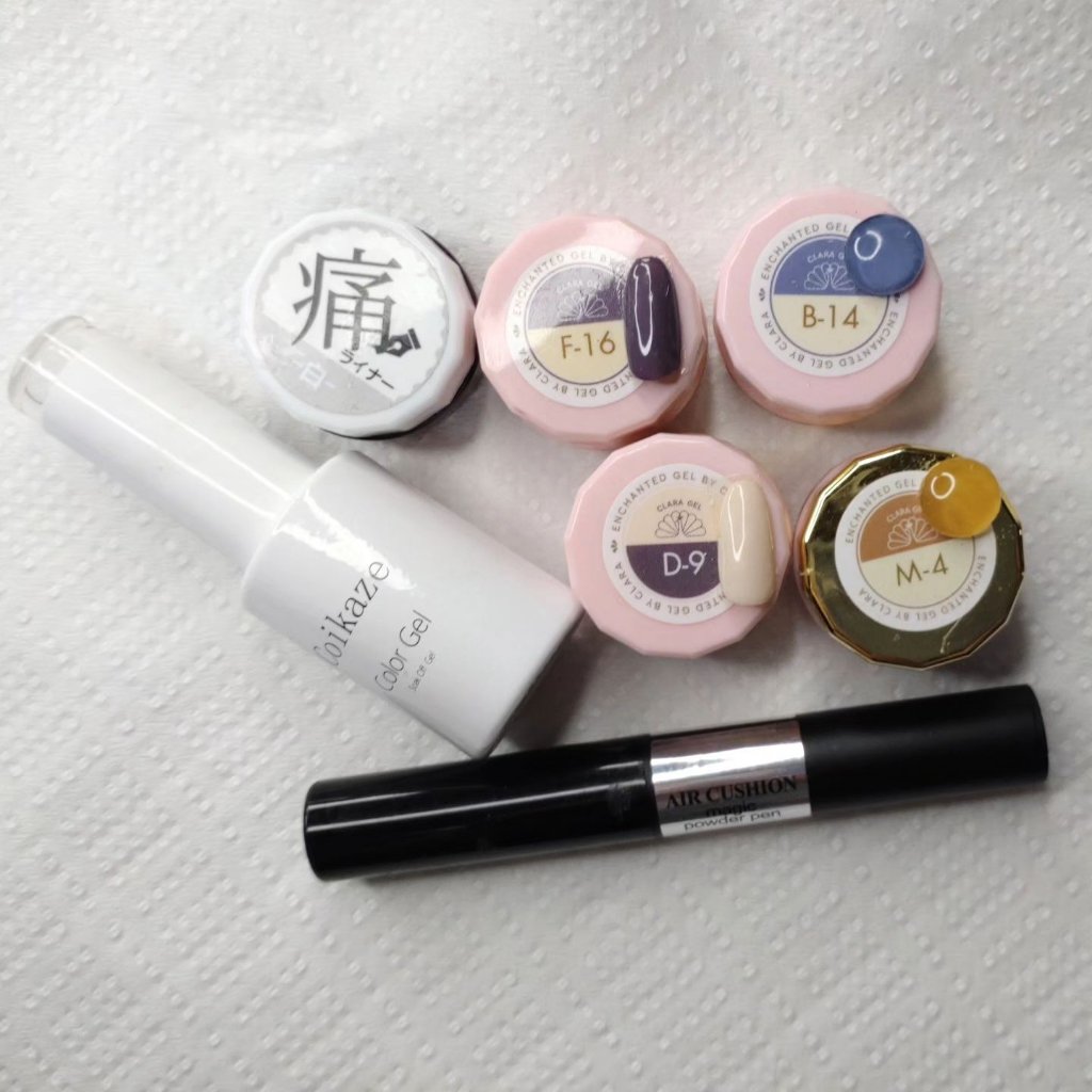 薄いベージュのマグネットにオレンジに光るオーロラパウダー擦ってトップ塗ってから、アイシングでライン描いてます。 粘土ジェルとか眉コームとか色々使った残骸が転がってるけど、基本のやり方が私にはちょうどいい感じでした。