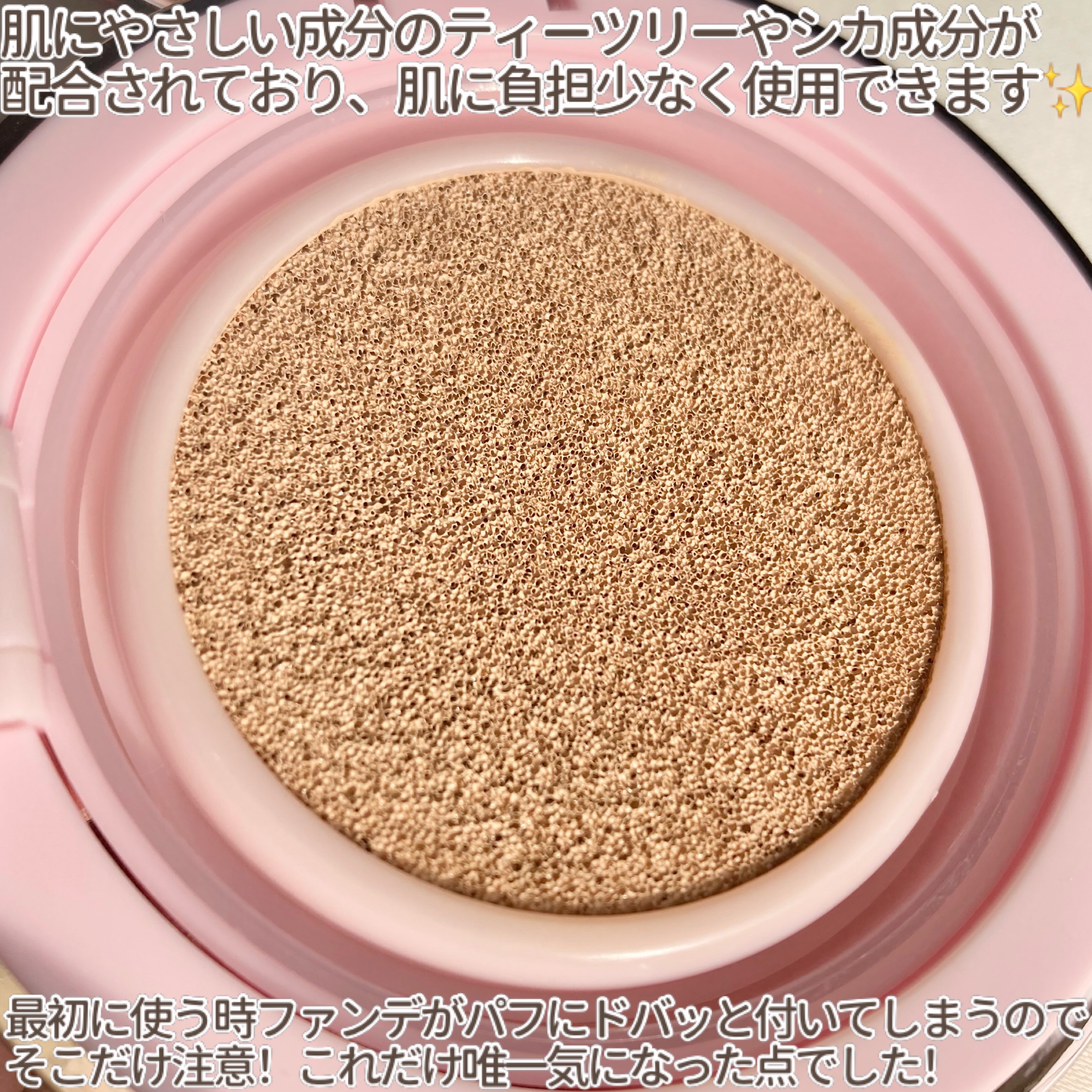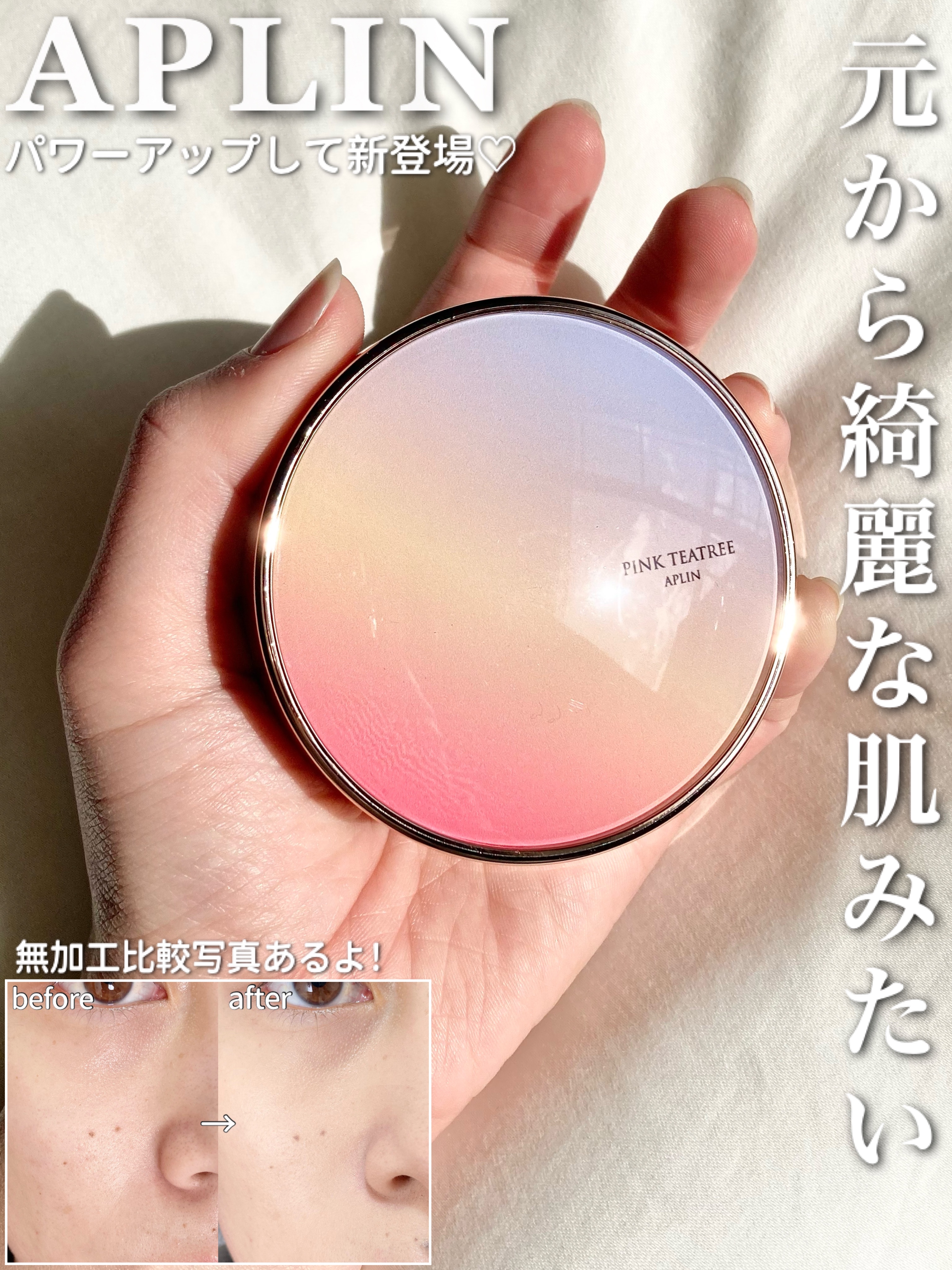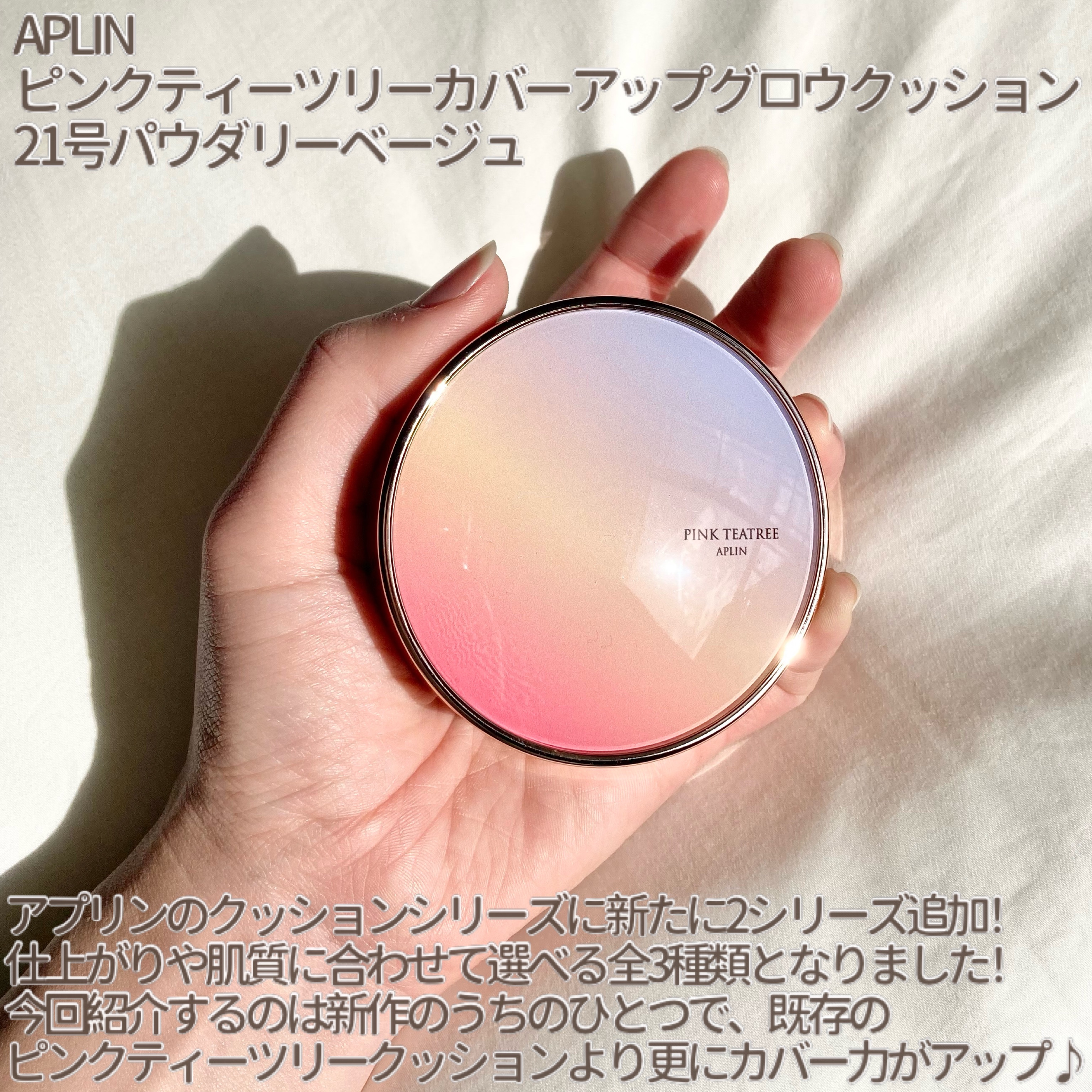 APLIN ピンクティーツリーカバークッション 21号ライトベージュ 2,490円(税込) 少量でよく伸びてハイカバー! 赤みやくすみをしっかりカバ一できるのに、厚塗り感のないなめらかな仕上がり♡ ハイカバーなのにナチュラルなツヤ感とサラッとしつつ、乾燥崩れしにくい仕上がりに感動します!!