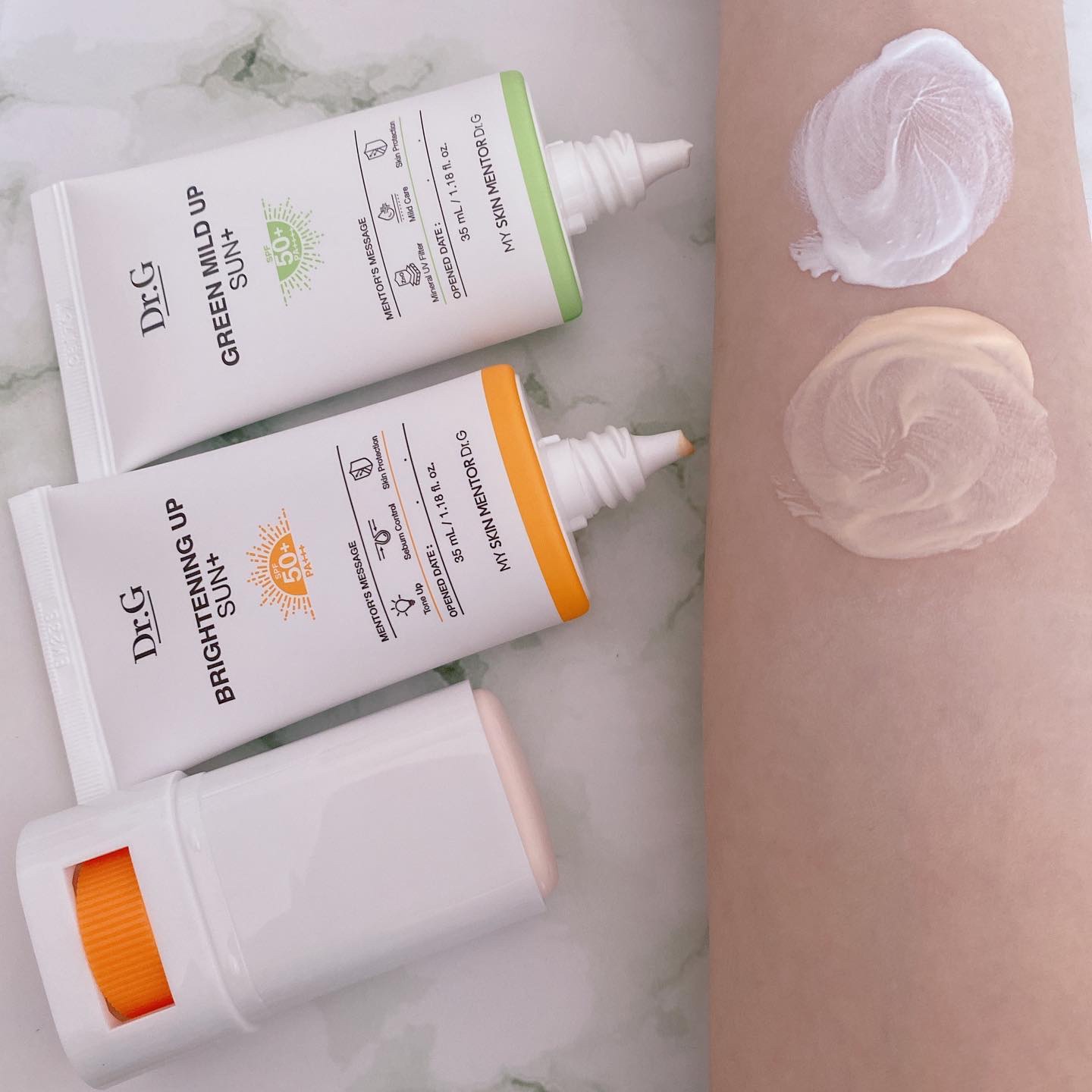 Dr.Gはクリームが本当に使い心地が良くて大好きな韓国のスキンケアブランドです🤍 ブライトニングアップサンプラスはピンクベージュカラーで下地として使うことも◎ 紫外線を肌に吸収せず、焼けない作りになっているそうです🩷 どちらもツボクサ、ドクダミ、プロビタミンDのスキンケア配合でお肌に優しい作りになってあるのが嬉しい😻 日焼け止めってピリピリしたりする事があるのですが、こちらはそんなことも無くとっても使い心地が良くてお気に入りになりました🫶🏻✨️