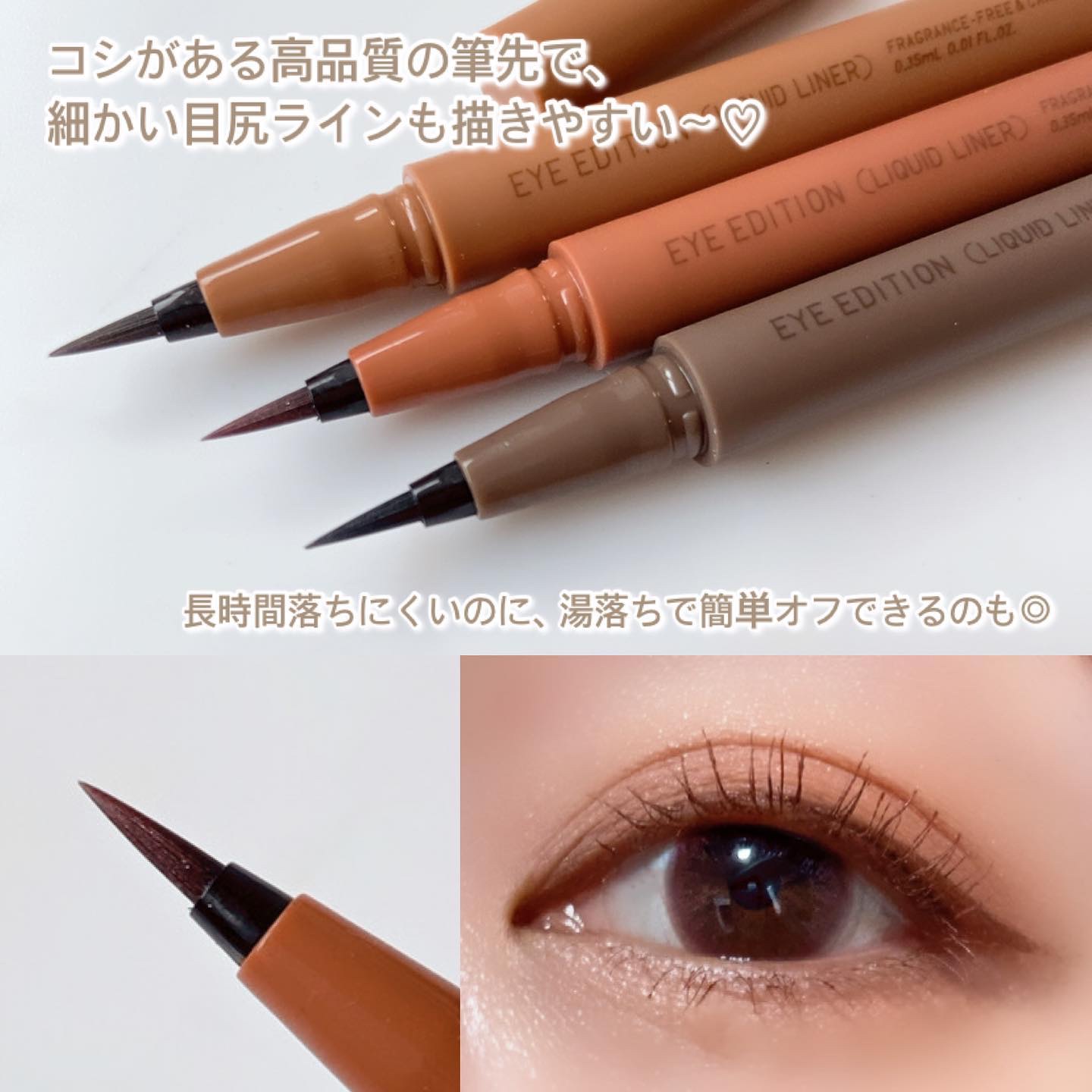 - 潤んだツヤを放つグロウパールで、 目尻ラインを印象的に引き立てるリキッドアイライナー 〇潤んだようなツヤを放つ高輝度なグロウパールと、絶妙ニュアンスカラーで目尻を引き立てる。 〇コシがあり、ブレずに描きやすい筆。 ー職人による手組み×専用設備で仕上げた高品質な筆 ー厳選した2種の毛を混毛 ー高輝度なグロウパール配合にも適した構造 〇つけたての仕上がりが長時間持続。 〇汗・皮脂・涙・こすれ・湿気に強い 〇ウォータープルーフ 〇お湯で簡単に落とせる。 〇美容液成分配合 ー保水成分(ヒアルロン酸) 〇無香料 〇アレルギーテスト済(すべての方にアレルギーが起きないというわけではありません)