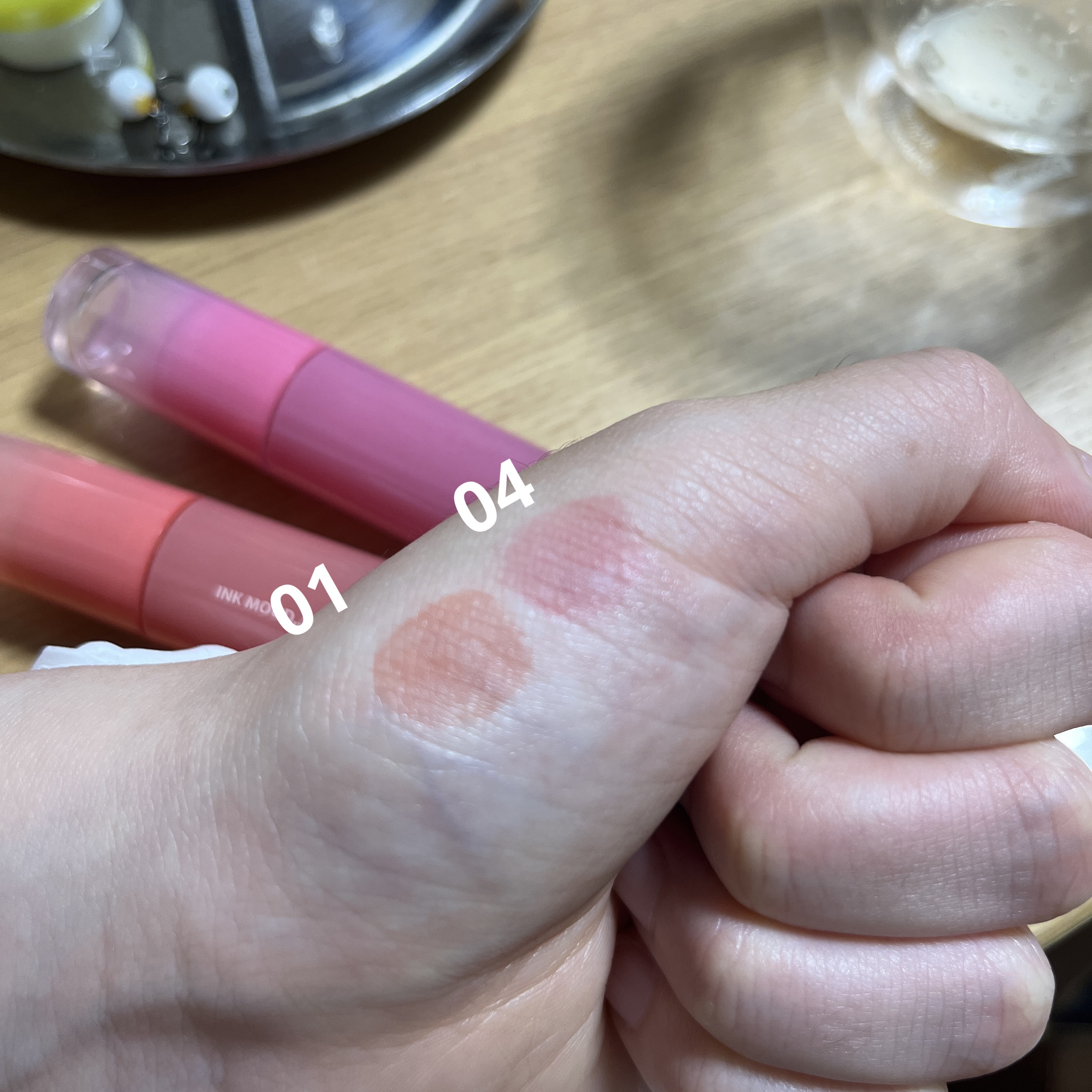 保湿されます。めんどくさい時はリップクリーム無しでもいけちゃいます。 透ける発色。さっと塗れば薄く、多めに塗れば発色もよくぷるぷるリップに仕上がります。盛耐性ない私でもいけます。 ツヤも良き。 蛍光色に変わらないところ。3枚目の通りティッシュオフしても綺麗な色のままです。 色持ちです。食べ物食べると普通に取れます。これに関してはリプモンの方がいい。 マスクに写る 甘い匂いがする。苦手な人は苦手かも。usjのバタービールの香りがします。私は好きです。