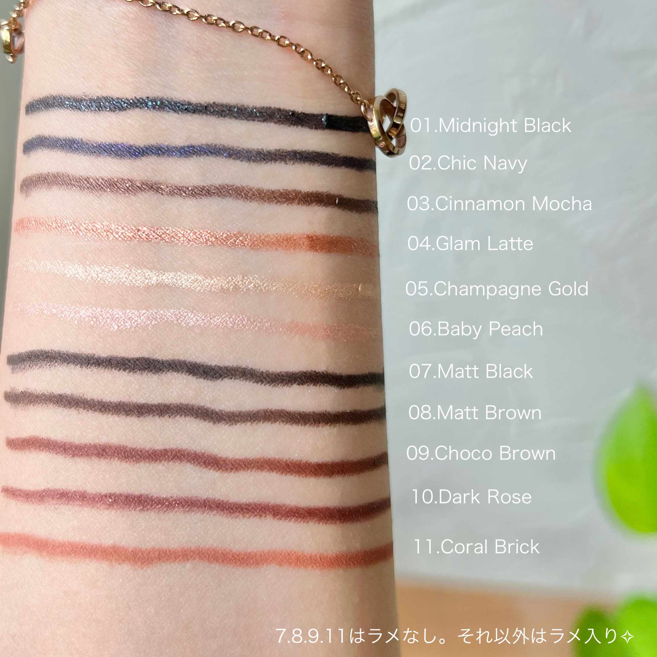 - <01 MIDNIGHT BLACK> トリメチルシロキシケイ酸、シクロペンタシロキサン、酸化鉄、ホウケイ酸(Ca/チタン),イソドデカン、ポリエチレン、合成ワックス、セレシン,トリイソステアリン酸ポリグリセリル-2、酸化チタン、ポリイソブテン、酸化スズ <02 CHIC NAVY> トリメチルシロキシケイ酸、シクロペンタシロキサン、酸化鉄、イソドデカン,ポリエチレン、酸化チタン、マイカ、合成ワックス,ホウケイ酸(Ca/Na)、セレシン、シリカ,トリイソステアリン酸ポリグリセリル-2、ポリイソブテン、コンジョウ <03 CINNAMON MOCHA> トリメチルシロキシケイ酸、シクロペンタシロキサン、イソドデカン、マイカ,酸化鉄、ポリエチレン、合成ワックス、酸化チタン、セレシン、ホウケイ酸(Ca/チタン),ホウケイ酸(Ca/Al)、トリイソステアリン酸ポリグリセリル-2、ポリイソブテン、シリカ、酸化スズ <04 GLAM LATTE> トリメチルシロキシケイ酸、シクロペンタシロキサン、マイカ、イソドデカン,ポリエチレン、酸化鉄、合成フルオロフロゴパイト、合成ワックス,ホウケイ酸(Ca/Al)、酸化チタン、セレシン,トリイソステアリン酸ポリグリセリル-2、シリカ、ポリイソブテン、酸化スズ <05 CHAMPAGNE GOLD> トリメチルシロキシケイ酸、シクロペンタシロキサン、マイカ、酸化チタン,イソドデカン、ポリエチレン、合成フルオロフロゴパイト、合成ワックス,セレシン、トリイソステアリン酸ポリグリセリル-2、酸化鉄、ポリイソブテン、カルミン <06 BABY PEACH> トリメチルシロキシケイ酸、シクロペンタシロキサン、マイカ、酸化チタン,イソドデカン、ポリエチレン、合成フルオロフロゴパイト、合成ワックス,セレシン、トリイソステアリン酸ポリグリセリル-2、酸化鉄、ポリイソブテン、カルミン <07 MATTE BLACK> 酸化鉄 (CI 77499)、トリメチルシロキシケイ酸、シクロペンタシロキサン、イソドデカン、ポリエチレン、合成ワックス、セレシン、マイカ (CI 77019)、キャンデリラロウ、シクロペンタシロキサン(アクリレーツ/メタクリル酸ポリトリメチルシロキシ)コポリマー、ポリイソブテン、ポリヒドロキシステアリン酸、レシチン、パルミチン酸エチルヘキシル、イソステアリン酸、ミリスチン酸イソプロピル、酢酸トコフェロール、カプリリルグリコール、ジメチコン、ポリリシノレイン酸ポリグリセリル-3 <08 MATTE BROWN> トリメチルシロキシケイ酸、シクロペンタシロキサン、酸化鉄 (CI 77499)、イソドデカン、ポリエチレン、酸化鉄 (CI 77491)、合成ワックス、酸化鉄 (CI 77492)、セレシン、マイカ (CI 77019)、キャンデリラロウ、シクロペンタシロキサン(アクリレーツ/メタクリル酸ポリトリメチルシロキシ)コポリマー、 ポリイソブテン、ポリヒドロキシステアリン酸、レシチン、パルミチン酸エチルヘキシル、イソステアリン酸、ミリスチン酸イソプロピル、酢酸トコフェロール、カプリリルグリコール、ジメチコン、ポリリシノレイン酸ポリグリセリル-3 <09 CHOCO BROWN> トリメチルシロキシケイ酸、シクロペンタシロキサン、酸化鉄 (CI 77491)、イソドデカン、マイカ (CI 77019)、ポリエチレン、酸化鉄 (CI 77499)、酸化鉄 (CI 77492)、合成ワックス、セレシン、酸化チタン (CI 77891)、キャンデリラロウ、合成フルオロフロゴパイト、ポリイソブテン、赤202 (CI 15850:1)、ポリヒドロキシステアリン酸、レシチン、パルミチン酸エチルヘキシル、イソステアリン酸、ミリスチン酸イソプロピル、ジメチコン、酢酸トコフェロール、カプリリルグリコール、ポリリシノレイン酸ポリグリセリル-3 <10 DARK ROSE> トリメチルシロキシケイ酸、シクロペンタシロキサン、イソドデカン、酸化鉄 (CI 77491)、マイカ (CI 77019)、ポリエチレン、ホウケイ酸(Ca/チタン)、合成ワックス、酸化鉄 (CI 77499)、酸化チタン (CI 77891)、セレシン、酸化鉄 (CI 77492)、キャンデリラロウ、赤202 (CI 15850:1)、酸化スズ (CI 77861)、ポリイソブテン、シクロペンタシロキサン(アクリレーツ/メタクリル酸ポリトリメチルシロキシ)コポリマー、ポリヒドロキシステアリン酸、レシチン、パルミチン酸エチルヘキシル、イソステアリン酸、ミリスチン酸イソプロピル、酢酸トコフェロール、カプリリルグリコール、ポリリシノレイン酸ポリグリセリル-3 <11 CORAL BRICK> トリメチルシロキシケイ酸、シクロペンタシロキサン、マイカ(CI 77019)、合成ワックス、メチルトリメチコン、合成フルオロフロゴパイト、酸化鉄(CI 77491)、セレシン、酸化チタン(CI 77891)、ホウケイ酸(Ca/Al)、キャンデリラロウ、ポリイソブテン、ポリヒドロキシステアリン酸、ジメチコン、レシチン、パルミチン酸エチルヘキシル、イソステアリン酸、ミリスチン酸イソプロピル、カプリル酸グリセリル、カプリリルグリコール、ポリリシノレイン酸ポリグリセリル-3、酸化スズ(CI 77861)