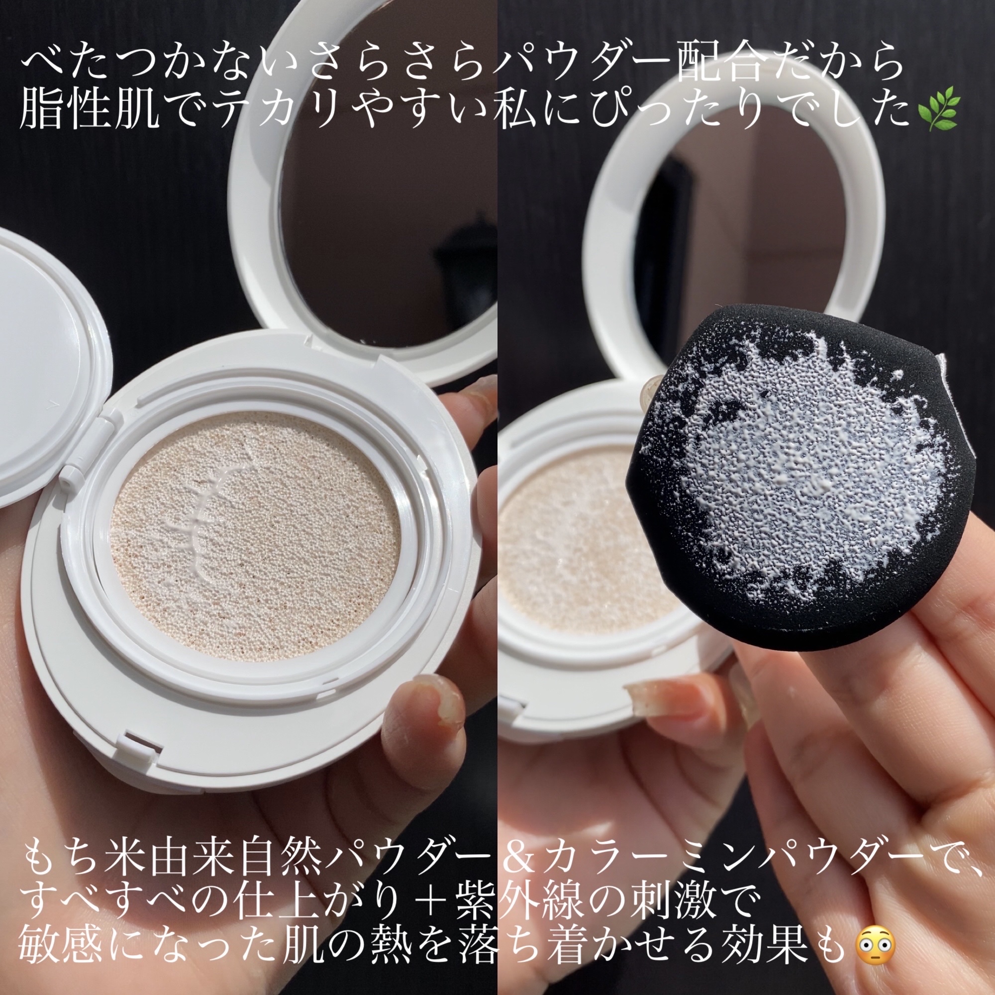 ミラーとしずく型のパフ付きで持ち運びにも便利。メイクの上から使えます😊 もち米由来の自然パウダーとカラーミングパウダーで紫外線で敏感になった肌の熱を落ち着かせてすべすべの仕上がりに。 ジュワッとみずみずしいテクスチャで肌に乗せるとややひんやり感あり。お肌もしっとり、明るく見えて小鼻の際の赤みもカバー✨