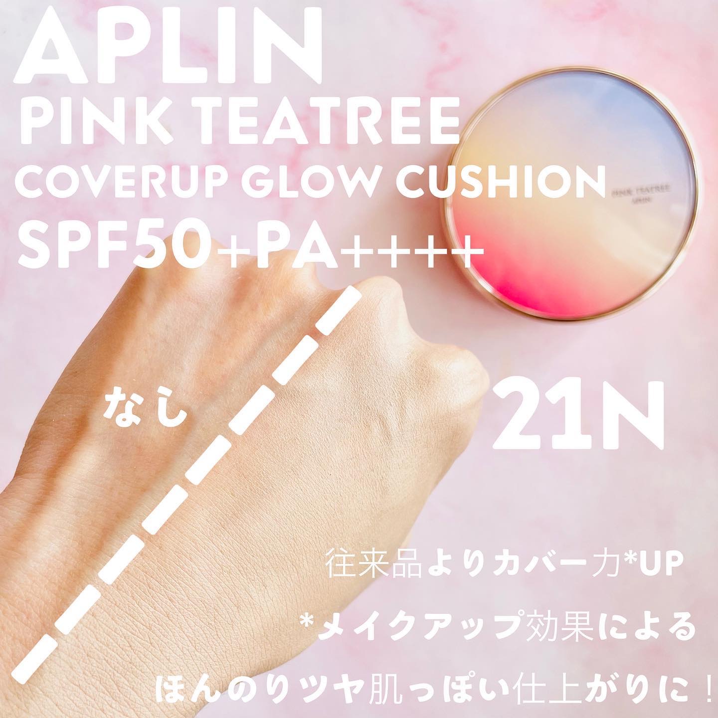 APLIN ピンクティーツリーカバークッション 21号ライトベージュ 2,490円(税込) 少量でよく伸びてハイカバー! 赤みやくすみをしっかりカバ一できるのに、厚塗り感のないなめらかな仕上がり♡ ハイカバーなのにナチュラルなツヤ感とサラッとしつつ、乾燥崩れしにくい仕上がりに感動します!!