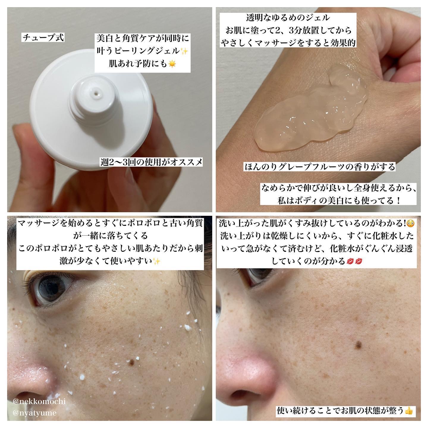 やさしくマッサージするだけでポロポロと古い角質を落としてツルンとなめらかなお肌へ導いてくれるピーリングジェルです! 美白有効成分である水溶性プラセンタエキス配合でメラニンの生成を抑え、シミ・ソバカスを防いでくれます◎ 更に有効成分グリチルリチン酸2K配合で肌荒れ、あれ性、にきびを防ぎます◎ またお肌への負担を軽減するための成分をポリマーから『米デンプン(保湿成分)』へと変更する事で、しっとり・やわらかな使い心地に◎ ゼリーのようなプルプルなテクスチャーで2~3分放置する事で美白有効成分が浸透! その後、優しくマッサージしていくとポロポロとした形状に変化! 洗い上がりはつるんとしていました!