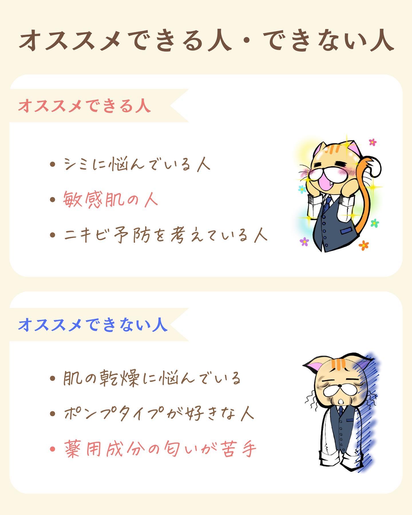 腕に塗布してから30分経過した肌水分量の平均増加率は+87%と優秀すぎる保湿力 サラッとした仕上がり DPG配合 美白有効成分のホワイトトラネキサム酸や、追加された肌荒れ防止有効成分のアラントインが配合 ぬるぬる感は強め 少ししっとりした仕上がりでしっとりタイプの乳液を塗ったような保湿力 有効成分のナイアシンアミドが配合 うるおい成分として3種類のヒアルロン酸が配合