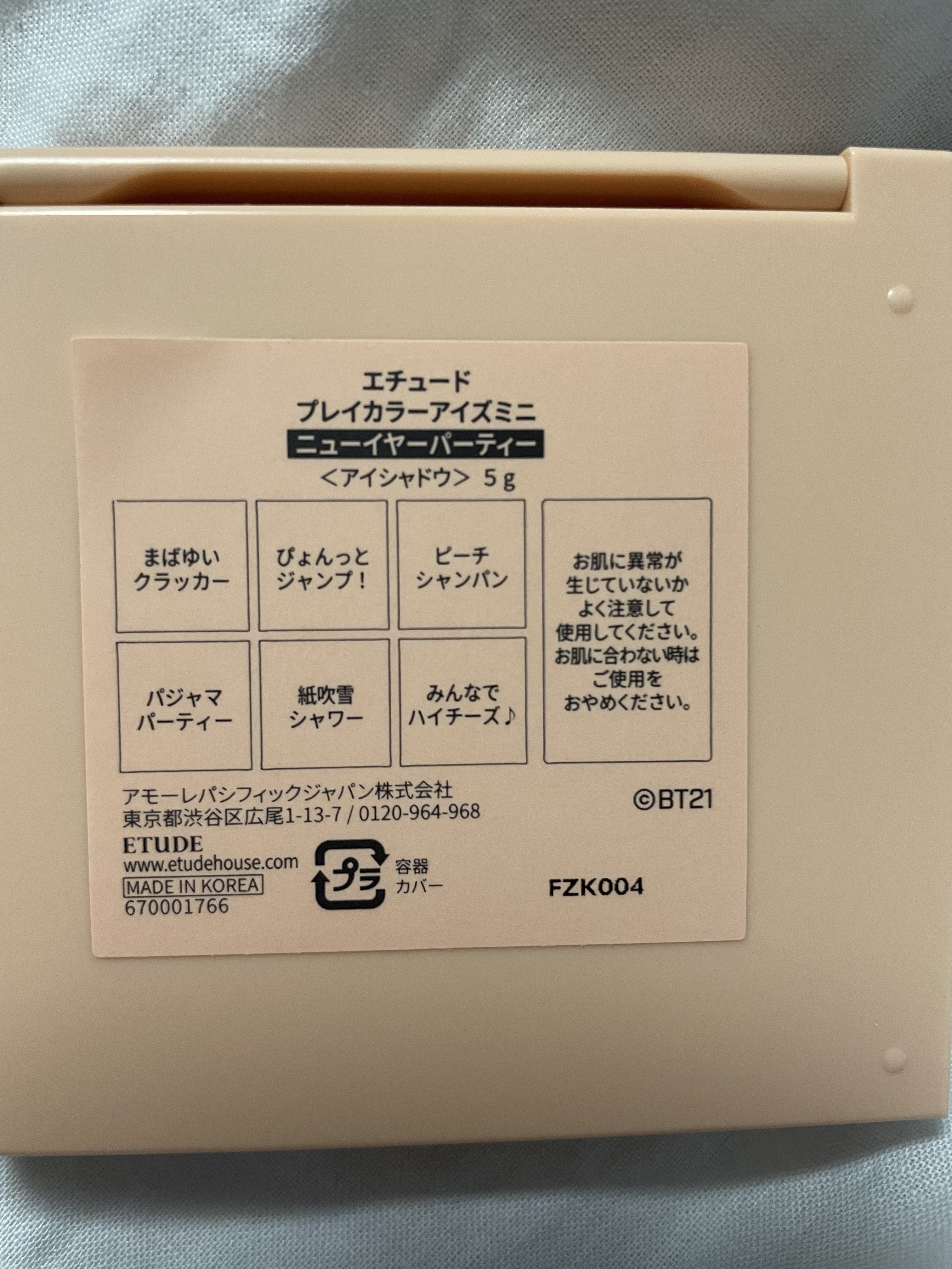 - BT21の限定ラビットデザイン 捨て色なしの6色パレットにチップがついて新登場! ニューイヤーパーティー ハッピーに彩るシュワッとゴールドとあったかブラウンで 華やかに煌めく目元に ①まばゆいクラッカー ②ぴょんっとジャンプ! ③ピーチシャンパン ④パジャマパーティー ⑤紙吹雪シャワー ⑥みんなでハイチーズ♪