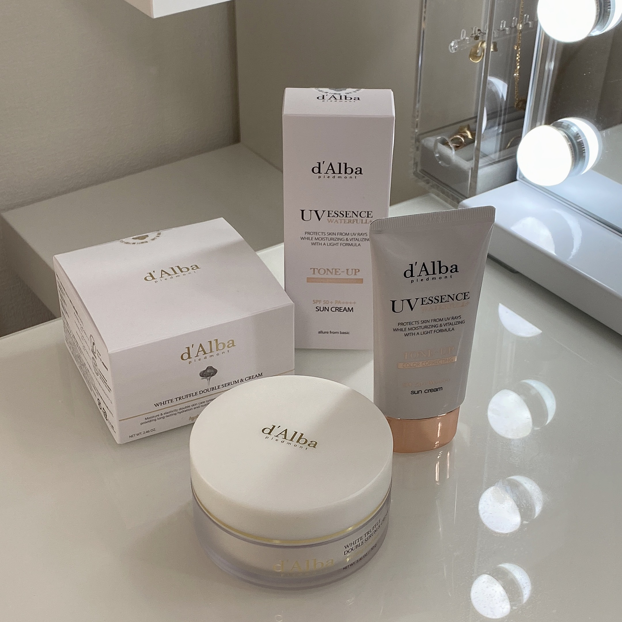 ダルバのダブルセラムアンドクリームが面白いんです💛🤍 黄色いアクアセラムと白っぽいインテンスクリームが半分ずつ入ったクリーム。 肌のコンディションに合わせてクリームの量を調整することで今丁度いい保湿ができるんです♪ ダルバといえばのホワイトトリュフでキメの整った肌に✨