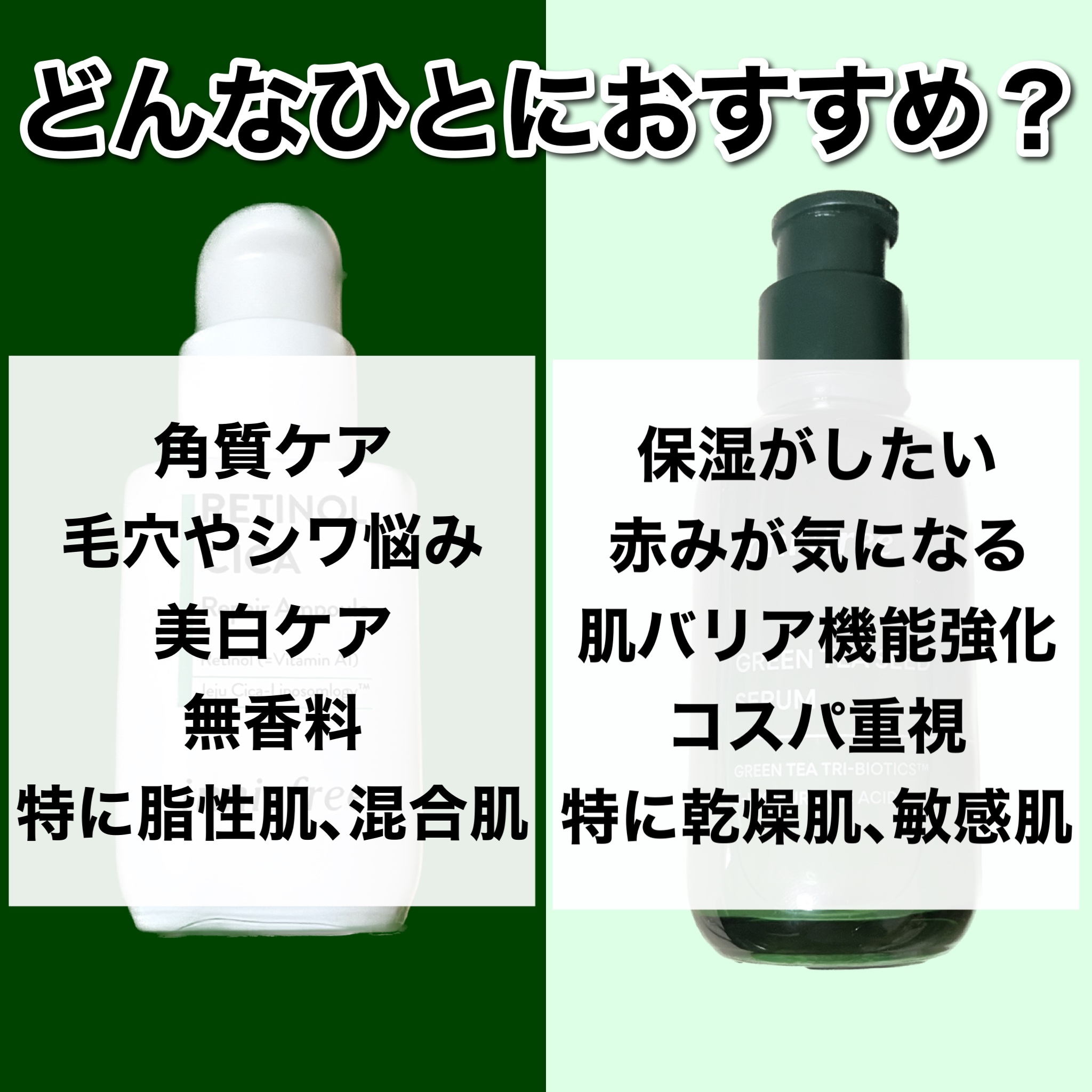 【肌への優しさ】innisfree ★★★★★ 敏感肌ならコレ! 【コスパ】VT ★★★★☆ 安いなぁ〜 【ツルツル感】VT ★★★★★ ツルツルになる