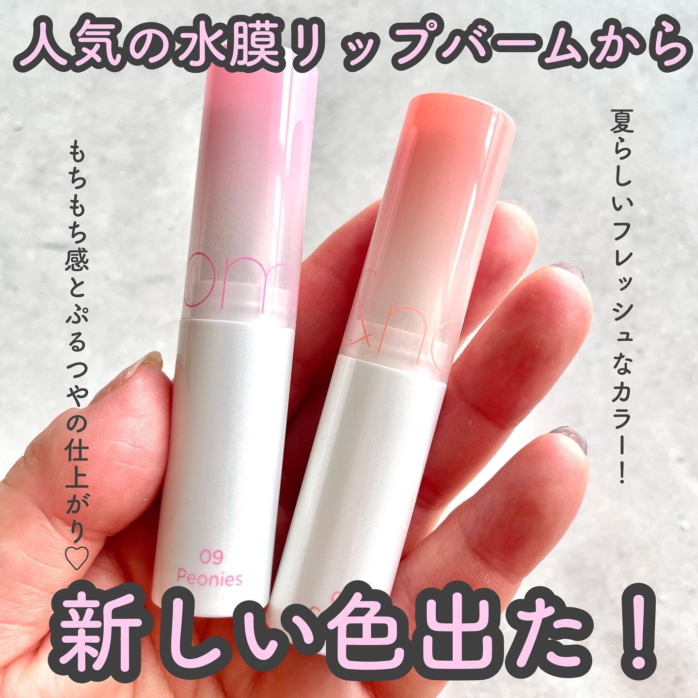 - もちっとした水膜で弾けそうなツヤリップ 1.軽い塗り心地のなめらかで透明な水爆弾ツヤ 2.塗った瞬間から唇を鮮やかに彩る多彩なカラーバーム 3.植物性保湿オイルでしっとりもっちり保湿バーム