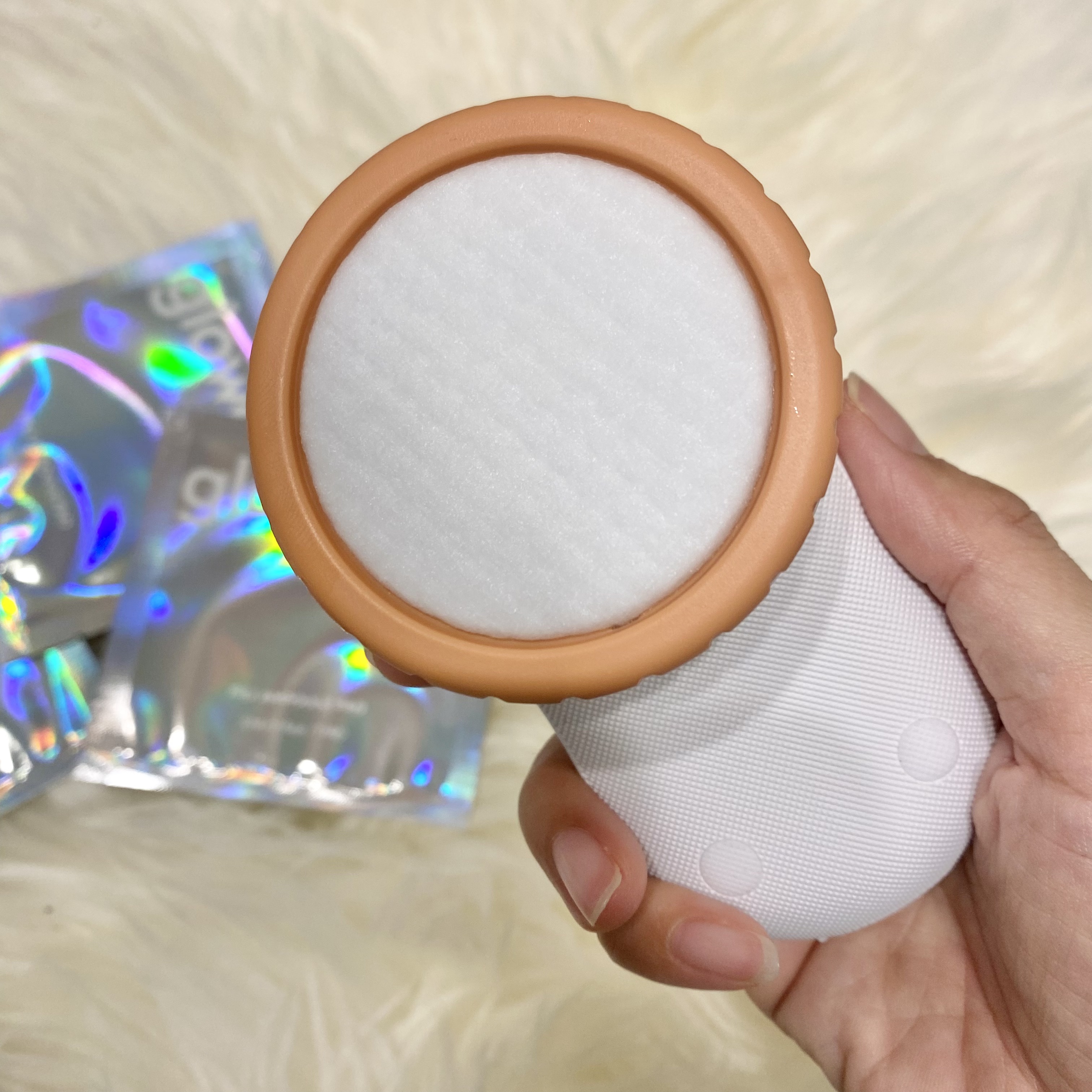これは角質ケアや毛穴ケアに。 使うことにより肌を保湿し艶やかな輝きのある肌へと導いてくれます。 4,500RPMの強力な振動が肌の弾力をケアします。 洗顔後にアンプルパッド1枚をのせ、キャップではめ込み、電源ボタンをオン。お顔にムラなく転がして老廃物を拭き取るように使います。2分半で自動オフ。 手軽にケアできそうです。