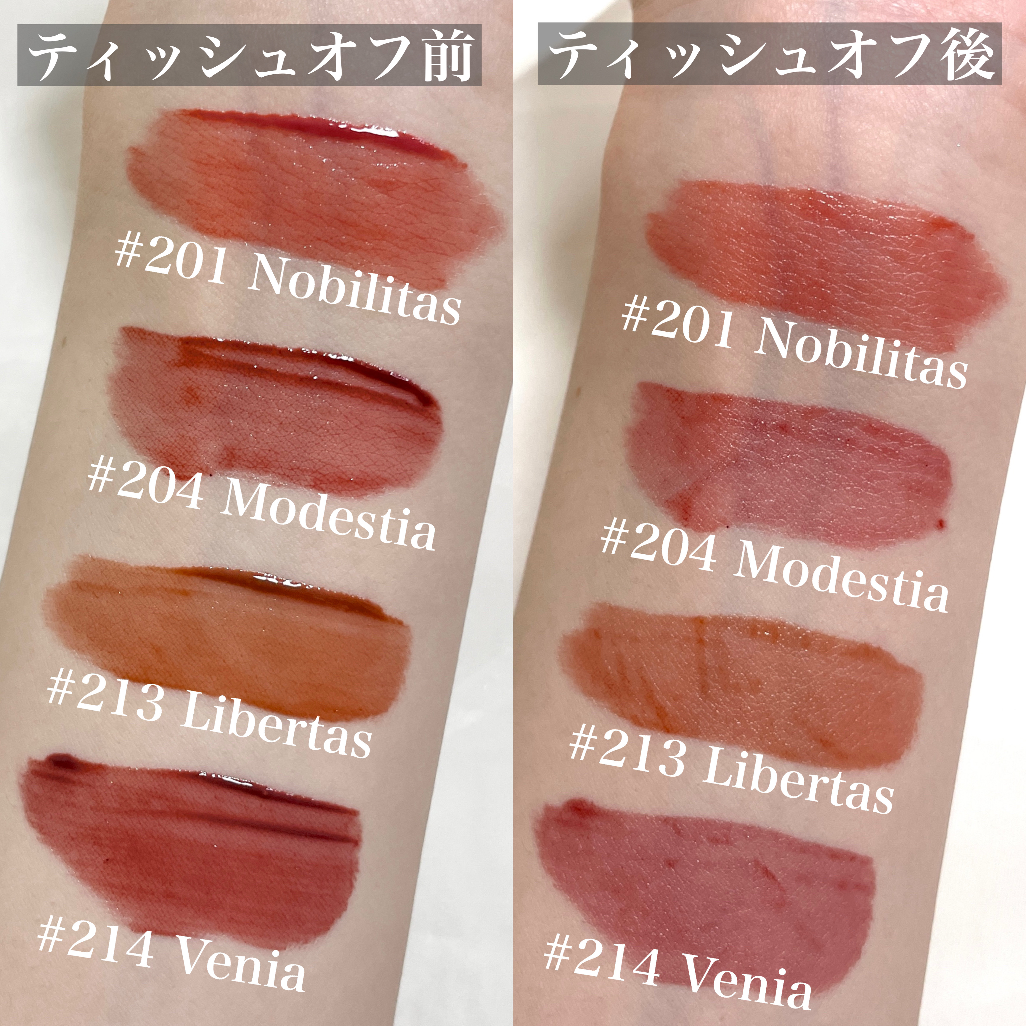 - <201 ノビリタス> 水、ジフェニルジメチコン、リンゴ酸ジイソステアリル、ビスジグリセリルポリアシルアジペート-2、オクチルドデカノール、水添ポリイソブテン、トリメチルシロキシフェニルジメチコン、ジグリセリン、セチルPEG/PPG-10/1ジメチコン、DPG、ポリソルベート60、イソステアリン酸ソルビタン、ペンチレングリコール、(アクリル酸ヒドロキシエチル/アクリロイルジメチルタウリンNa)コポリマー、セテアリルアルコール、スクワラン、酸化チタン、黄4、赤227、エチルヘキシルグリセリン、安息香酸ベンジル、黄5、香料、水酸化Al、ポリアクリル酸アンモニウム、リナロール、フェノキシエタノール、BG、塩化Na、青1、ヘキシルシンナマル、トコフェロール <202 ソフィア> 水、ジフェニルジメチコン、リンゴ酸ジイソステアリル、オクチルドデカノール、水添ポリイソブテン、トリメチルシロキシフェニルジメチコン、ジグリセリン、DPG、セチルPEG/PPG-10/1ジメチコン、ポリソルベート60、イソステアリン酸ソルビタン、ペンチレングリコール、(アクリル酸ヒドロキシエチル/アクリロイルジメチルタウリンNa)コポリマー、セテアリルアルコール、スクワラン、酸化チタン、黄5、赤227、エチルヘキシルグリセリン、安息香酸ベンジル、香料、リナロール、水酸化Al、ポリアクリル酸アンモニウム、青1、BG、フェノキシエタノール、ヘキシルシンナマル、トコフェロール <203 ディビニタス> 水、ジフェニルジメチコン、リンゴ酸ジイソステアリル、ビスジグリセリルポリアシルアジペート-2、オクチルドデカノール、水添ポリイソブテン、トリメチルシロキシフェニルジメチコン、ジグリセリン、セチルPEG/PPG-10/1ジメチコン、DPG、ポリソルベート60、イソステアリン酸ソルビタン、ペンチレングリコール、(アクリル酸ヒドロキシエチル/アクリロイルジメチルタウリンNa)コポリマー、セテアリルアルコール、スクワラン、酸化チタン、黄5、赤227、エチルヘキシルグリセリン、安息香酸ベンジル、香料、水酸化Al、ポリアクリル酸アンモニウムリナロール、青1、フェノキシエタノール、BG、ヘキシルシンナマル、トコフェロール <204 モデスティア> 水、ジフェニルジメチコン、リンゴ酸ジイソステアリル、オクチルドデカノール、ビスジグリセリルポリアシルアジペート-2、水添ポリイソブテン、トリメチルシロキシフェニルジメチコン、ジグリセリン、DPG、セチルPEG/PPG-10/1ジメチコン、ポリソルベート60、イソステアリン酸ソルビタン、ペンチレングリコール、(アクリル酸ヒドロキシエチル/アクリロイルジメチルタウリンNa)コポリマー、セテアリルアルコール、スクワラン、酸化チタン、黄5、赤104(1)、赤227、エチルヘキシルグリセリン、安息香酸ベンジル、香料、青1、水酸化Al、ポリアクリル酸アンモニウム、リナロール、フェノキシエタノール、BG、ヘキシルシンナマル、トコフェロール <205 ユスティティア> 水、ジフェニルジメチコン、リンゴ酸ジイソステアリル、ビスジグリセリルポリアシルアジペート-2、オクチルドデカノール、水添ポリイソブテン、トリメチルシロキシフェニルジメチコン、ジグリセリン、セチルPEG/PPG-10/1ジメチコン、DPG、ポリソルベート60、イソステアリン酸ソルビタン、ペンチレングリコール、(アクリル酸ヒドロキシエチル/アクリロイルジメチルタウリンNa)コポリマー、セテアリルアルコール、スクワラン、酸化チタン、黄4、赤227、エチルヘキシルグリセリン、安息香酸ベンジル、黄5、香料、水酸化Al、ポリアクリル酸アンモニウム、リナロール、フェノキシエタノール、BG、塩化Na、青1、ヘキシルシンナマル、トコフェロール <206 グラティア> 水、ジフェニルジメチコン、リンゴ酸ジイソステアリル、ビスジグリセリルポリアシルアジペート-2、オクチルドデカノール、水添ポリイソブテン、トリメチルシロキシフェニルジメチコン、ジグリセリン、セチルPEG/PPG-10/1ジメチコン、DPG、ポリソルベート60、イソステアリン酸ソルビタン、ペンチレングリコール、(アクリル酸ヒドロキシエチル/アクリロイルジメチルタウリンNa)コポリマー、セテアリルアルコール、スクワラン、酸化チタン、黄4、赤227、エチルヘキシルグリセリン、安息香酸ベンジル、黄5、香料、水酸化Al、ポリアクリル酸アンモニウム、リナロール、フェノキシエタノール、BG、塩化Na、青1、ヘキシルシンナマル、トコフェロール <213 リベルタス> 水、ジフェニルジメチコン、リンゴ酸ジイソステアリル、ビスジグリセリルポリアシルアジペート-2、オクチルドデカノール、水添ポリイソブテン、トリメチルシロキシフェニルジメチコン、ジグリセリン、DPG、セチルPEG/PPG-10/1ジメチコン、ポリソルベート60、イソステアリン酸ソルビタン、1,2-ヘキサンジオール、ペンチレングリコール、酸化チタン(CI 77891)、(アクリル酸ヒドロキシエチル/アクリロイルジメチルタウリンNa)コポリマー、セテアリルアルコール、スクワラン、黄5、エチルヘキシルグリセ