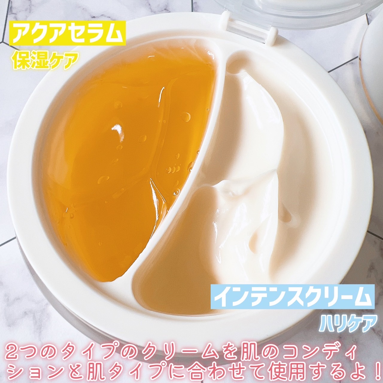 アクアセラムは、ヒアルロン酸、パンテノール、ツボクサエキスが含まれた、さっぱりとした使用感で肌に水分を与え肌のキメを整えます。 インテンスクリームは、イタリア産ホワイトトリュフが含まれた、もっちりした使用感で肌にうるおいを与えツヤのあるもち肌へ導きます。 パカッと開く内蓋が付いていて、蓋の裏にクリームが付かない仕様になってるのが嬉しい!