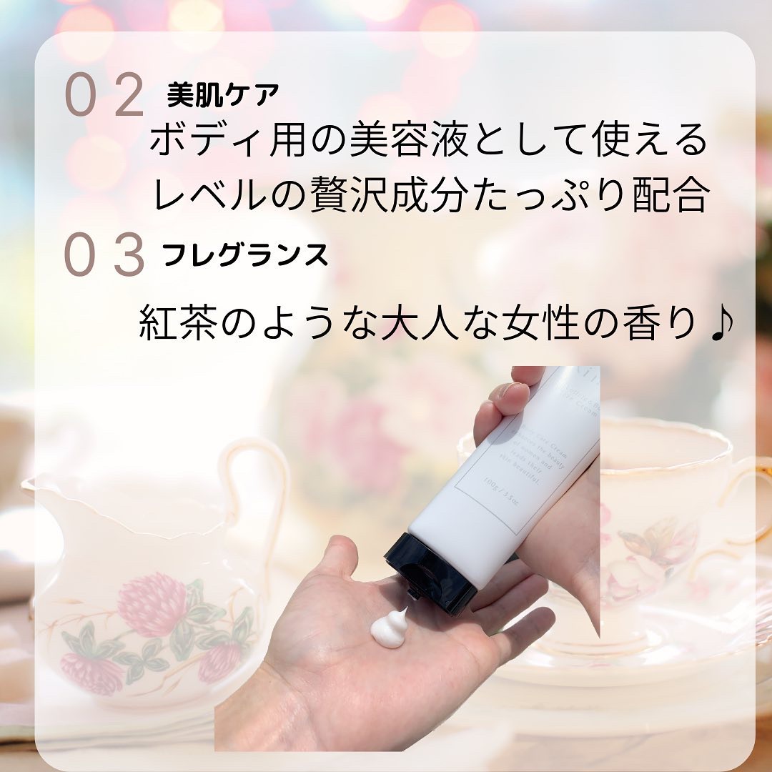 - 首筋からデコルテ、バストにかけて使うボディクリームです。塗るだけで速攻、パール感によるツヤ肌を演出できます。また香りにもこだわり、ベルガモットジャスミンにしました。