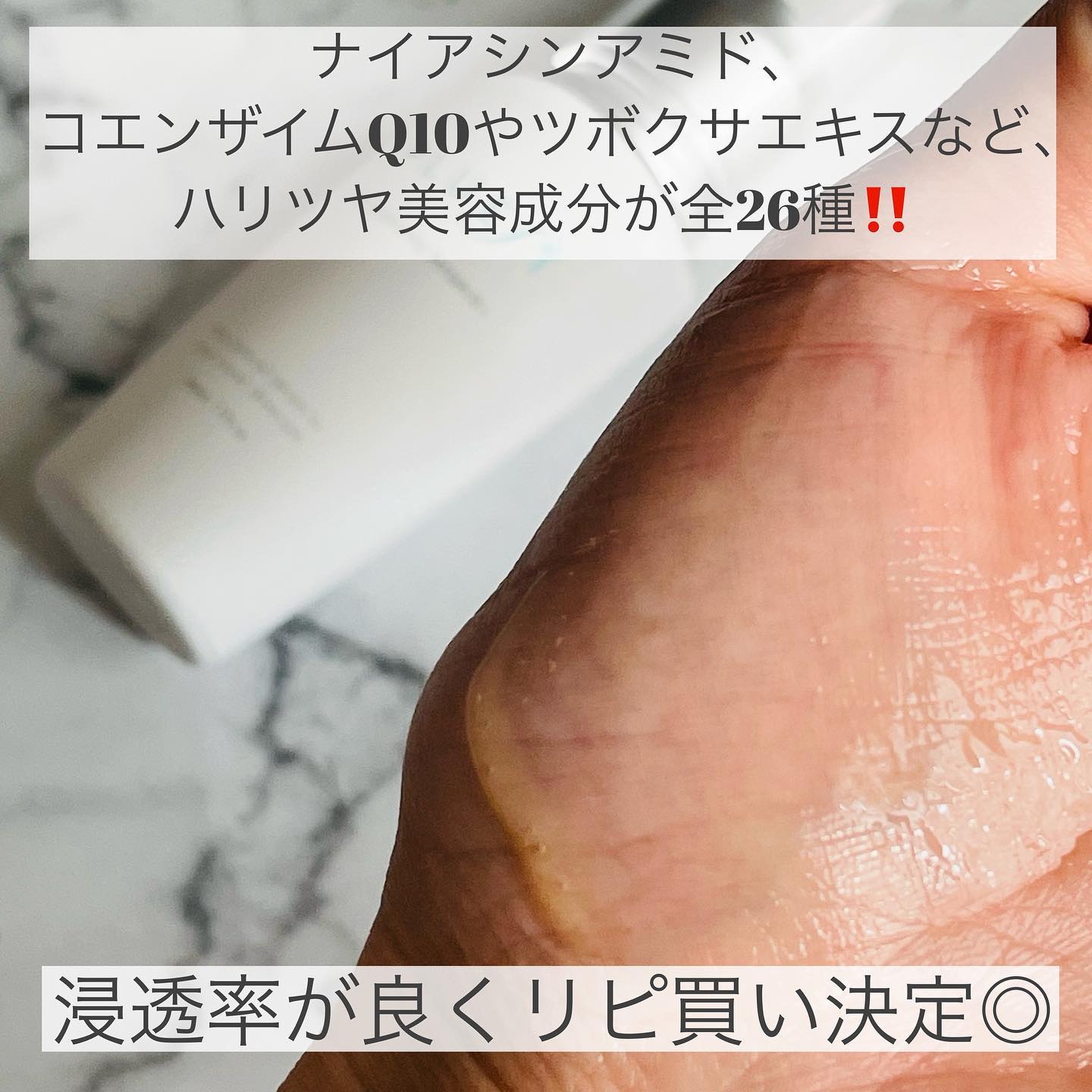 乾いた肌を保水し、シワ改善、シミ予防を同時に叶えてくれる美容液🌼 シワを緩和しツヤを与えるハリケア成分「ナイアシンアミド」、「コエンザイムQ10」や「CICA」、「ビタミンC誘導体」 ジェルタイプで、肌に塗るとすーっと伸びて馴染みがとても良かったです。 ベタつき感もないので朝のスキンケアでも使えそうです!