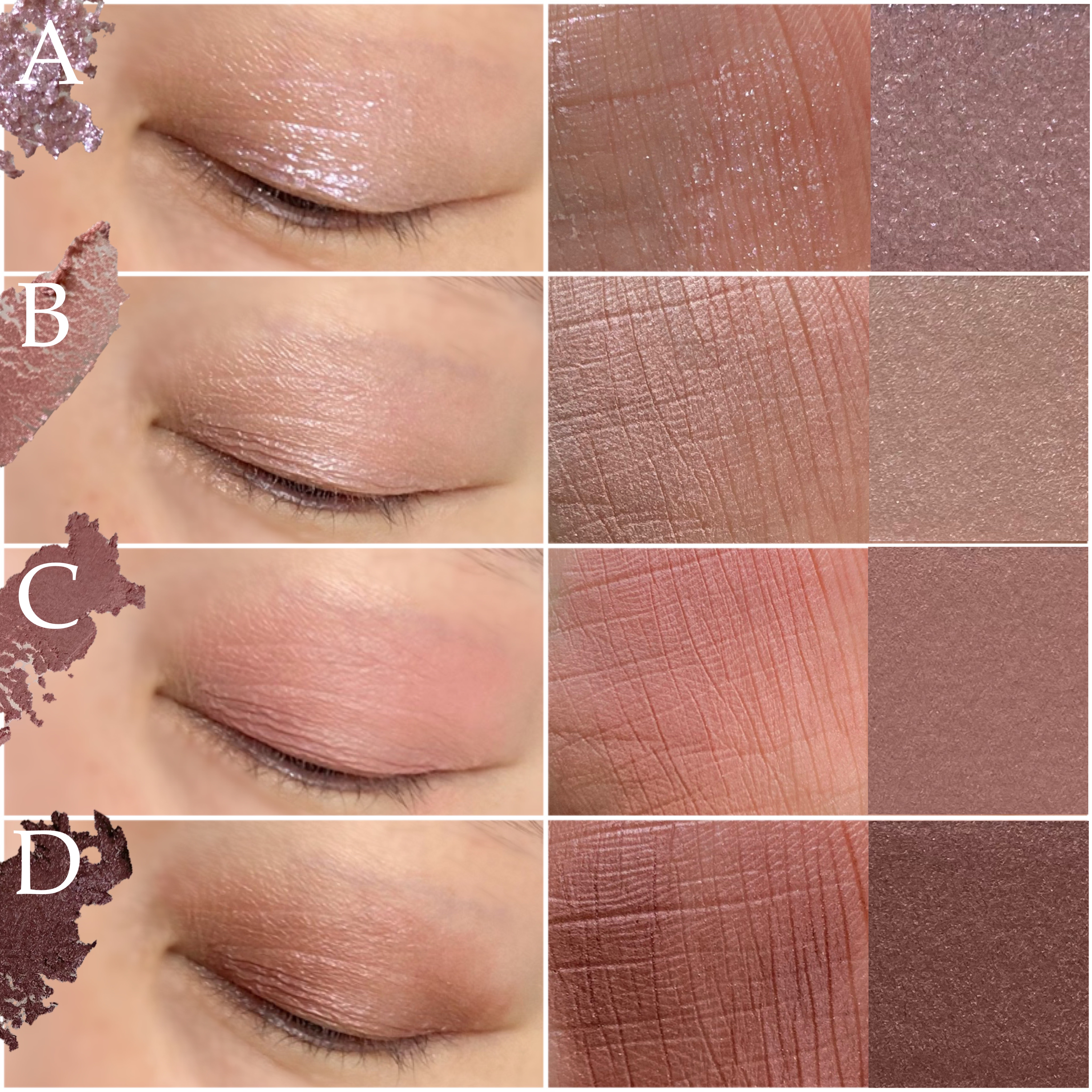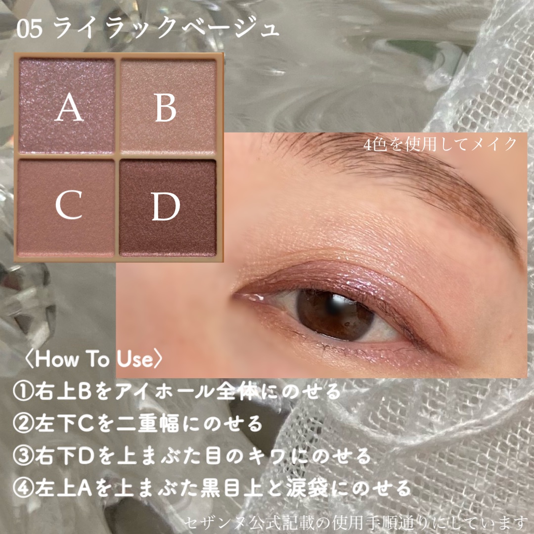- ラメ・パール・マット3質感の4色アイシャドウ。 肌馴染みの良いベージュを基調としたカラー。ラメ・パール・マットの3質感を重ねて、自然にまぶたを強調し奥行のある大きな目元へ。 しっとり溶け込むような柔らかなパウダーなので、スルスル伸びてまぶたにピタッと密着。保湿成分(スクワラン・ホホバ種子油)配合。