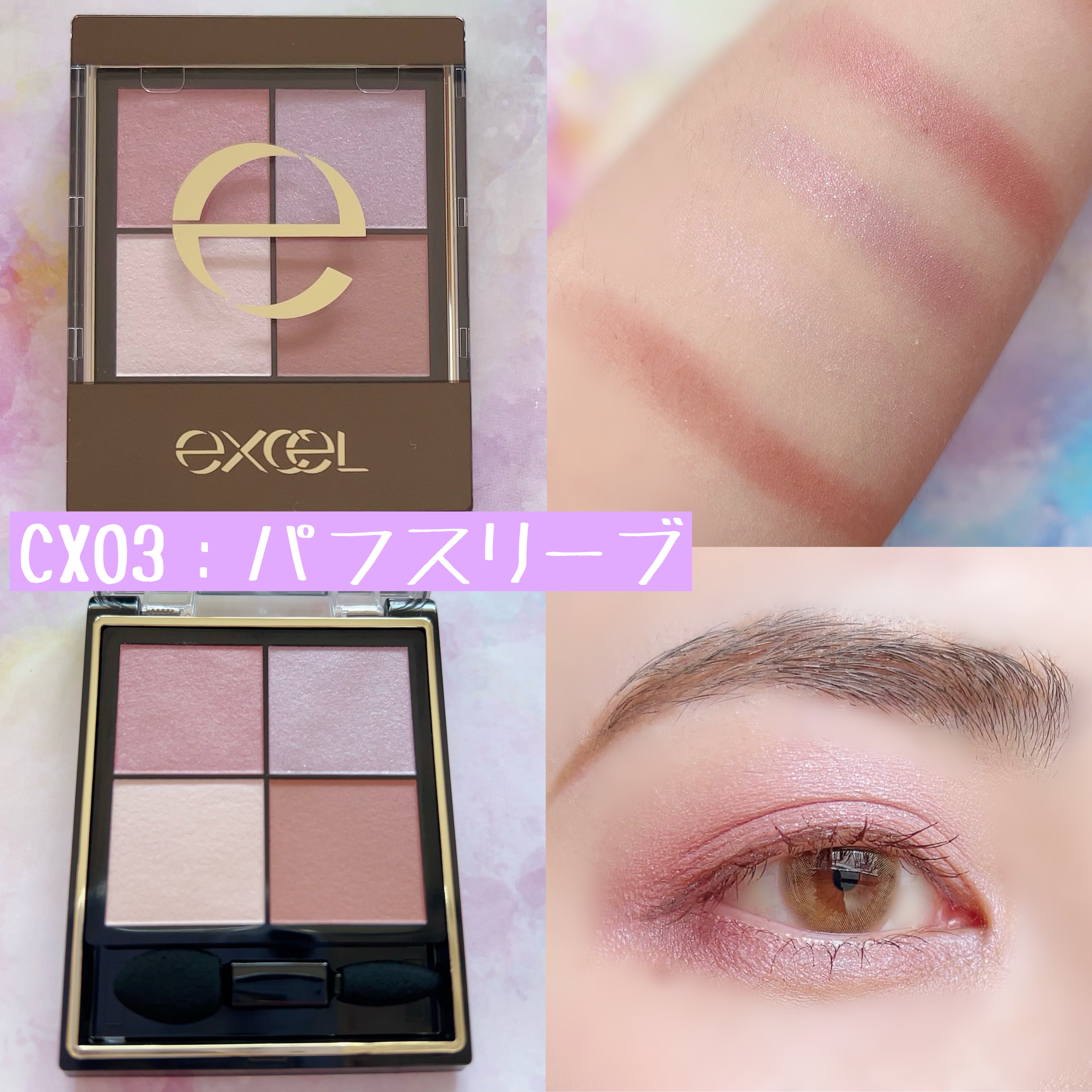 - 1.重ねてもくすまないクリアな発色。ナチュラルに溶け合う絶妙4カラー。 ツヤタイプ(左上・左下カラー):アイホール全体にぼかしたり、目尻へのポイント使いも。 ラメタイプ(右上カラー):アイホール中心や下まぶたにきらめきのアクセント。 マットタイプ(右下カラー):単色で陰影を付けたり、ツヤタイプと重ねてニュアンスをプラス。 2.うっとりするほどリッチな質感で粉飛びしないのに、軽いタッチで伸びて重ねやすいテクスチャー。 3.スクワラン(保湿)配合で目元の乾燥を防ぎます。 [PERFORMANCE] 色と質感の重ね着を楽しむ、ファッション感覚アイシャドウパレット [DESIGN] ・まぶたにひっかからない、なめらかな上質チップ ・薄型コンパクトだからポーチの中でかさばらない [QUALITY] 1.重ねてもくすまないクリアな発色 ナチュラルに溶け合う絶妙4カラー 2.パールの重ね技でまぶたに極上のツヤ感 微細多色 カラーパール 銀コーティング ガラスパール* excel GOLD-MIX処方(金パール配合)* (*右上のシャイニーカラーのみ) 3.うっとりするほどリッチな質感で粉飛び知らず!なのに、軽いタッチで伸びて重ねやすい 4.スクワラン(保湿)配合で目元の乾燥を防ぐ