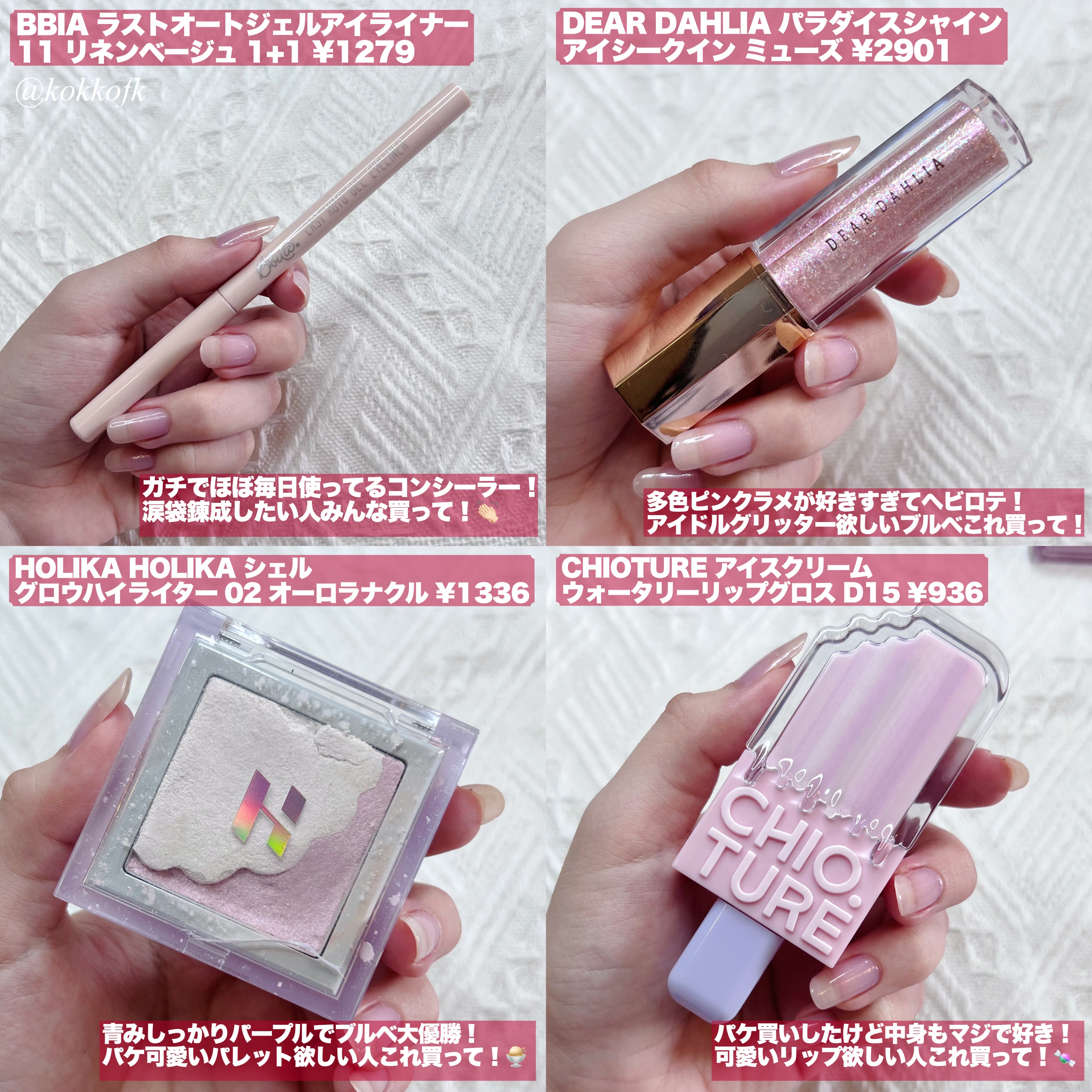 rom&nd────────────ベターザンパレット06 PEONY NUDE GARDEN (¥2900) rom&nd────────────ベターザンアイズ W03 Dry Strawberry (¥1569) HOLIKA HOLIKA────────────マイフェブムードアイパレットMOONY (¥2050) HOLIKA HOLIKA────────────マイフェブムードアイパレットPINK OLOGY (¥2050) CLIO────────────プロ アイ パレット13 PICNIC BY THE SUNSET (¥2390) PERIPERA────────────オール テイク ムード パレット04 MUTEFUL ROSE (¥1590) PERIPERA────────────オール テイク ムード パレット09 MOONLIKE LAVENDER PINK (¥1590) PERIPERA────────────インク ポケット シャドウ パレット05 TOUCHING TARO STARS (¥1190)