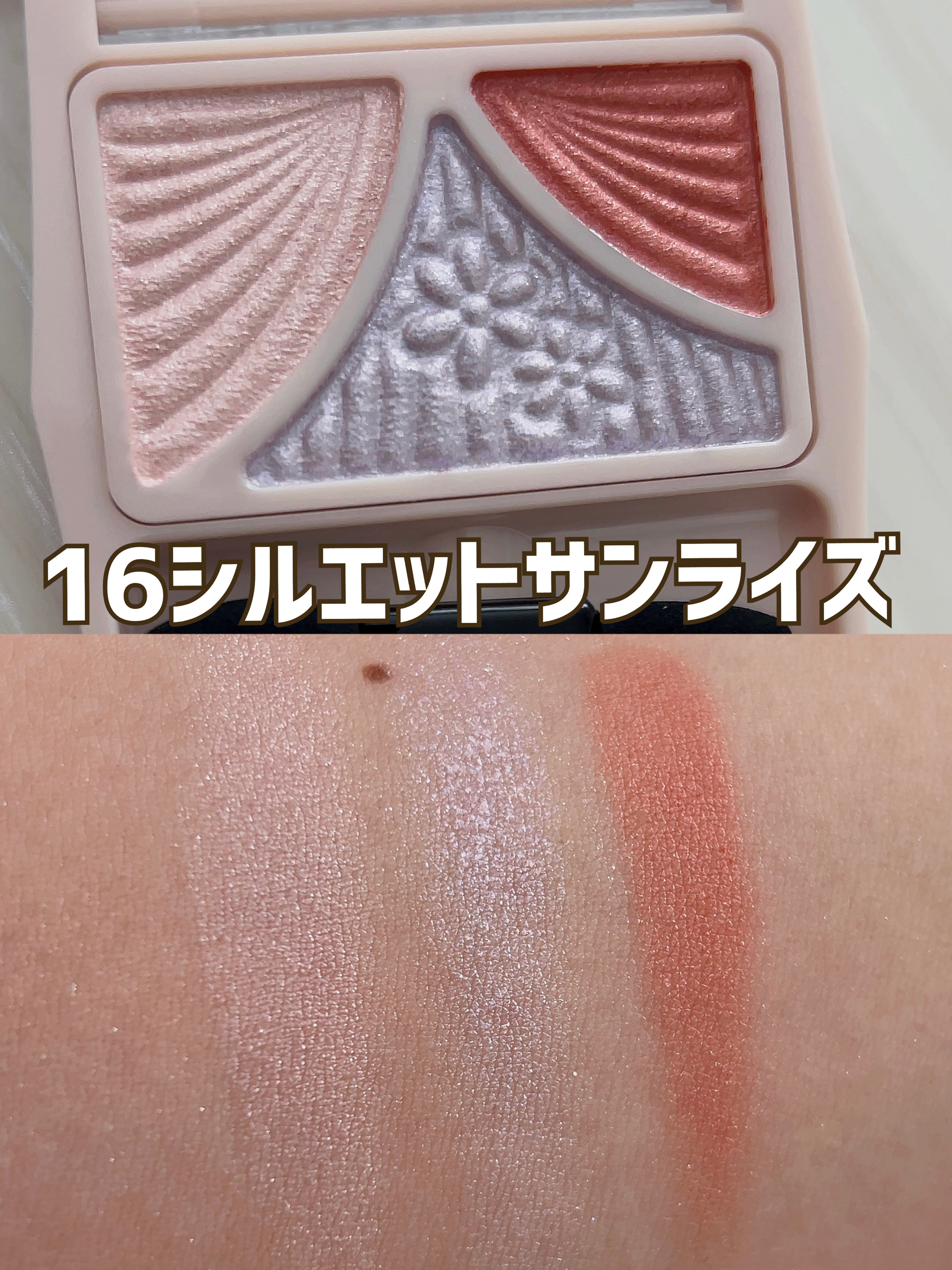 - パウダーなのにみずみずしい♥ 自然な立体感をつくりだす3色アイシャドウパレット 仕上げのコートで、ジューシー感&モチUP! メインカラー&ラインカラーはフィッティングオイル配合のしっとりパウダーで、 まぶたに吸いつくように溶け込み、ジューシーコートスフレで覆うことによって、 濡れたようにツヤめく愛されまぶたで透明感のある目元を演出します。