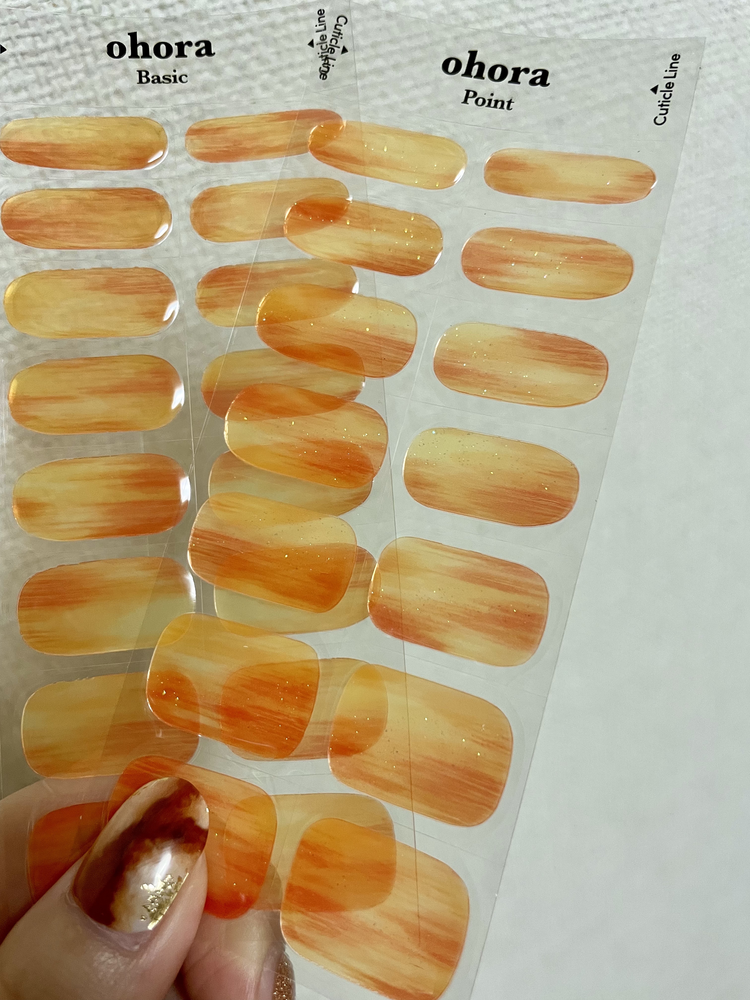 ohoraジェルネイルシール大好きなオホーラこちらのデザインはまだらなオレンジにキラキラの入ったデザインオホーラは本当に簡単に貼れて爪も傷つけない優秀✨#初夏のオレンジメイク...